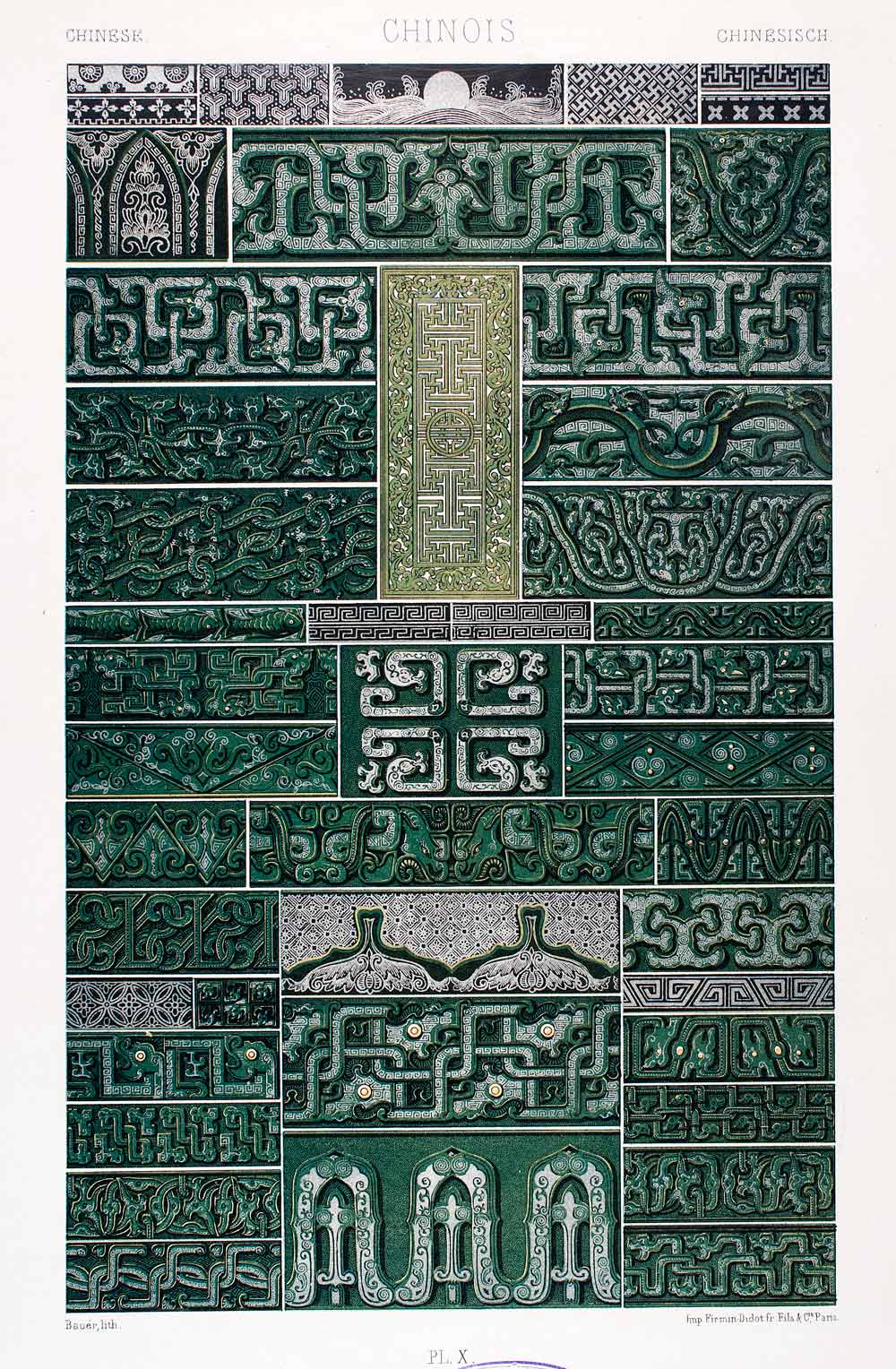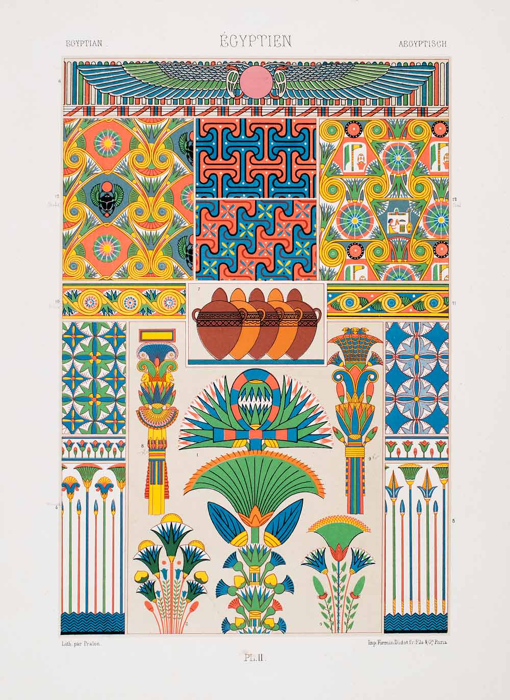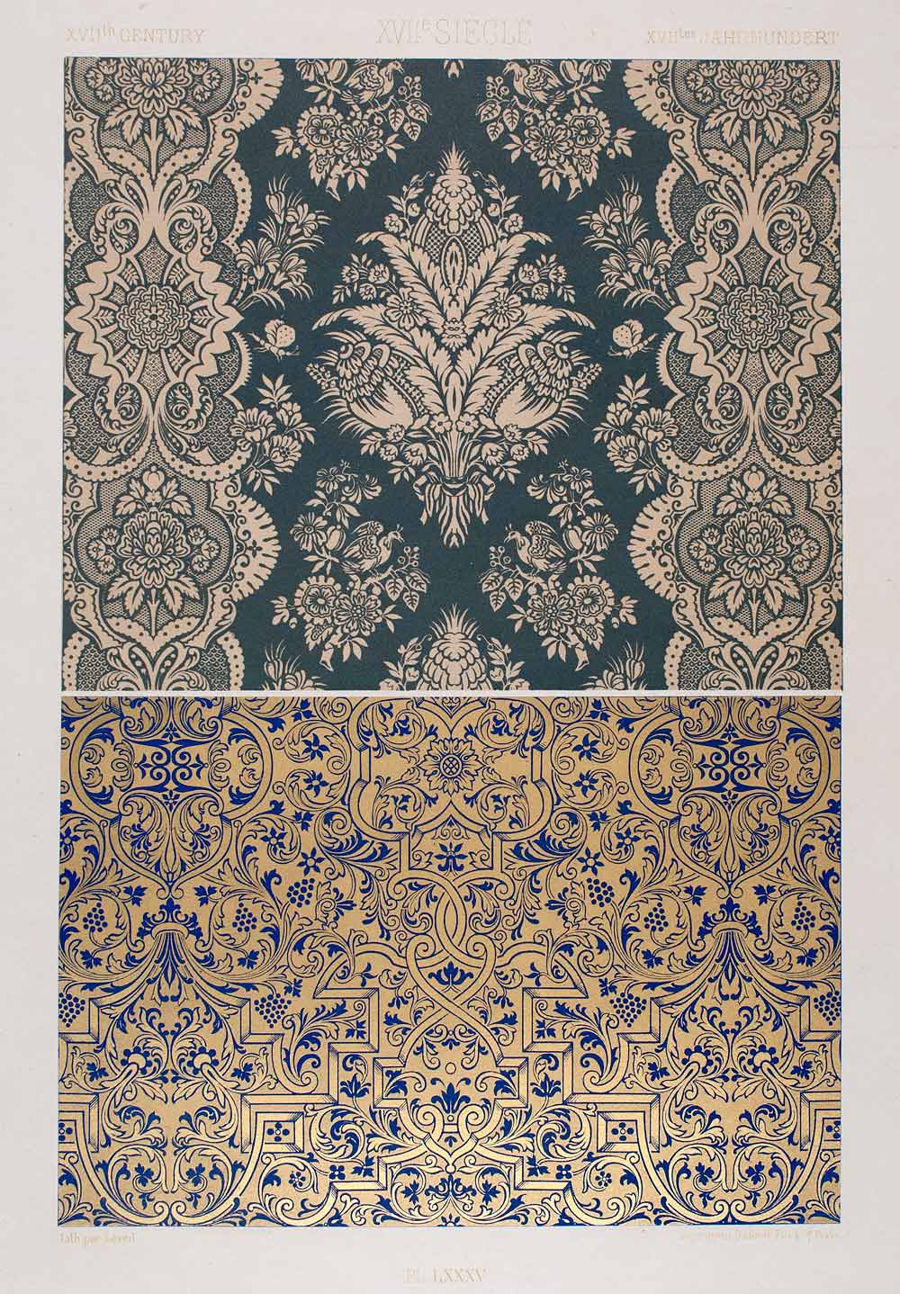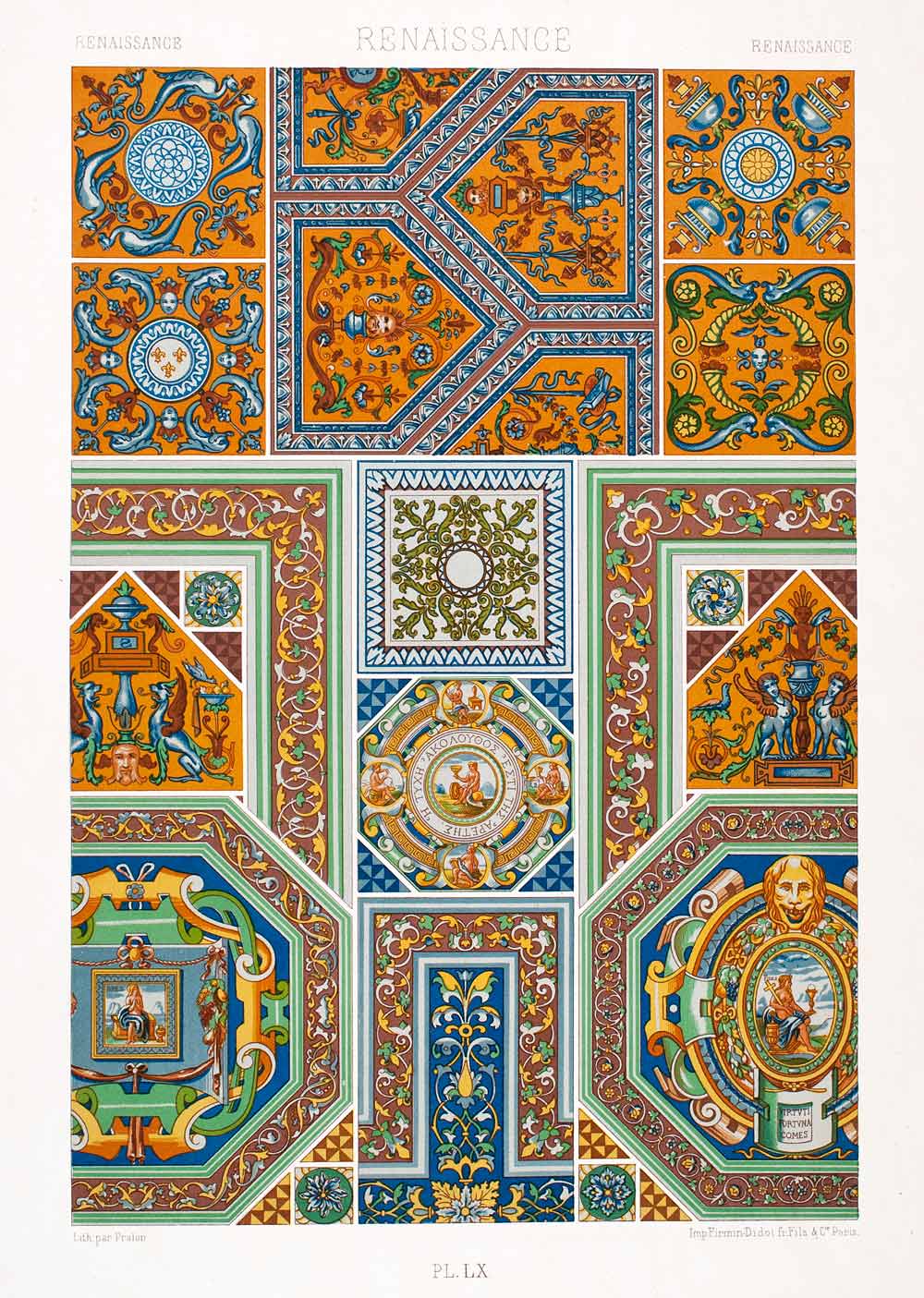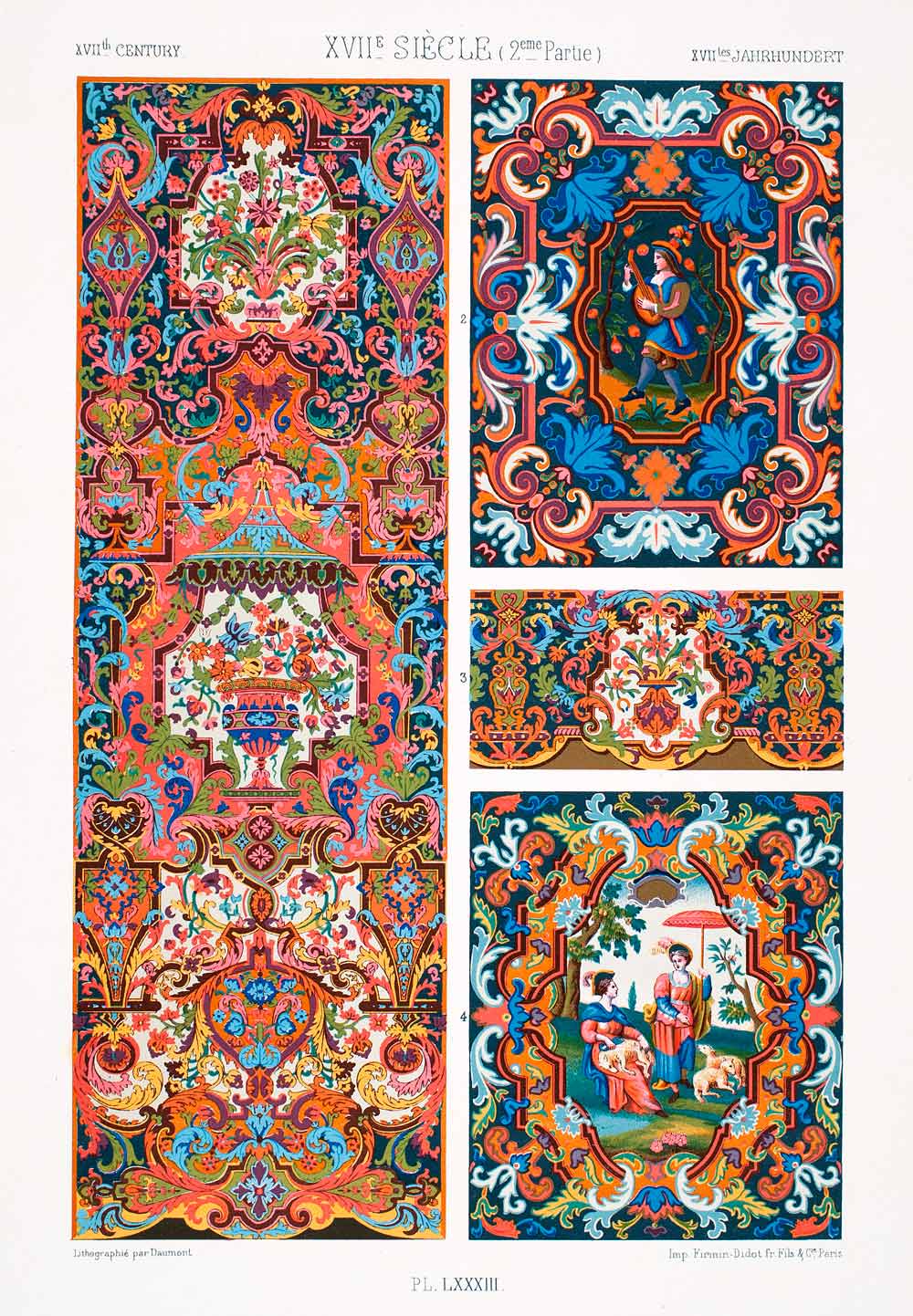 Auguste Racinet (1825-1893) began working on this collection in the mid 19th century. In production for nearly two decades, the immense project resulted in a spectacular work that showcases specific decorative and ornamental pattern work, reflecting a broad range of historical periods. Design elements illustrated were taken from historic fabrics, frescos, illuminated manuscripts, mosaics, and architectural elements from diverse time periods and world cultures. Racinet intended for it to be used for practical inspiration among contemporary designers and decorators. His concise and expert editing served to clearly identify large movements of art history and decorative arts.