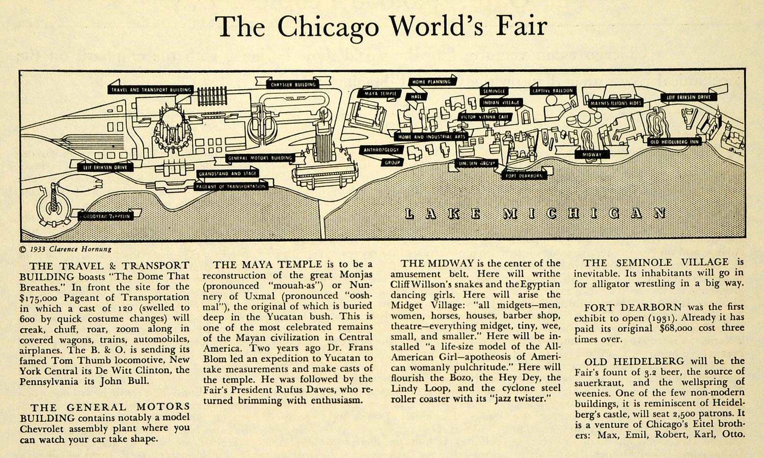 This is an original 1933 halftone print map of the 1933 Chicago World's Fair. Shown in the image is the locations of Leif Eriksen Drive, the Goodyear Zeppelin, the Travel & Transport Building, the General Motors Building, the Grandstand and Stage, the Pageant of Transportation, the Chrysler Building, the Maya Temple, the Anthropology Hall, the Home & Industrial Arts Building, the Fort Dearborn Building, the Victor Vienna Cafe, the Indian Village, the Seminole Village, the Captive Balloon, the Mayne's Illions Rides, the Midway, the Old Heidelberg Inn and the Lincoln Group.