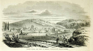 This is an original 1854 black and white in-text wood engraving of Valley Forge, Pennsylvania, the famous military camp of General George Washington and the American Continental Army during the winter of 1777-1778 during American Revolutionary War.