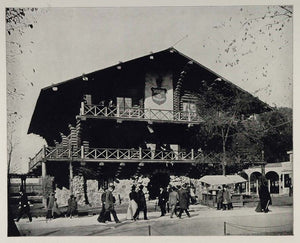 This is an original 1893 halftone print of the Idaho State Building at the 1893 Chicago World's Fair. Built of native materials, this structure was a log house built on a foundation of lava and basaltic rock. After the fair it was purchased to be used as a summer residence near a Northern resort. (Please note that, typical of halftone prints, there is printing on the reverse.)