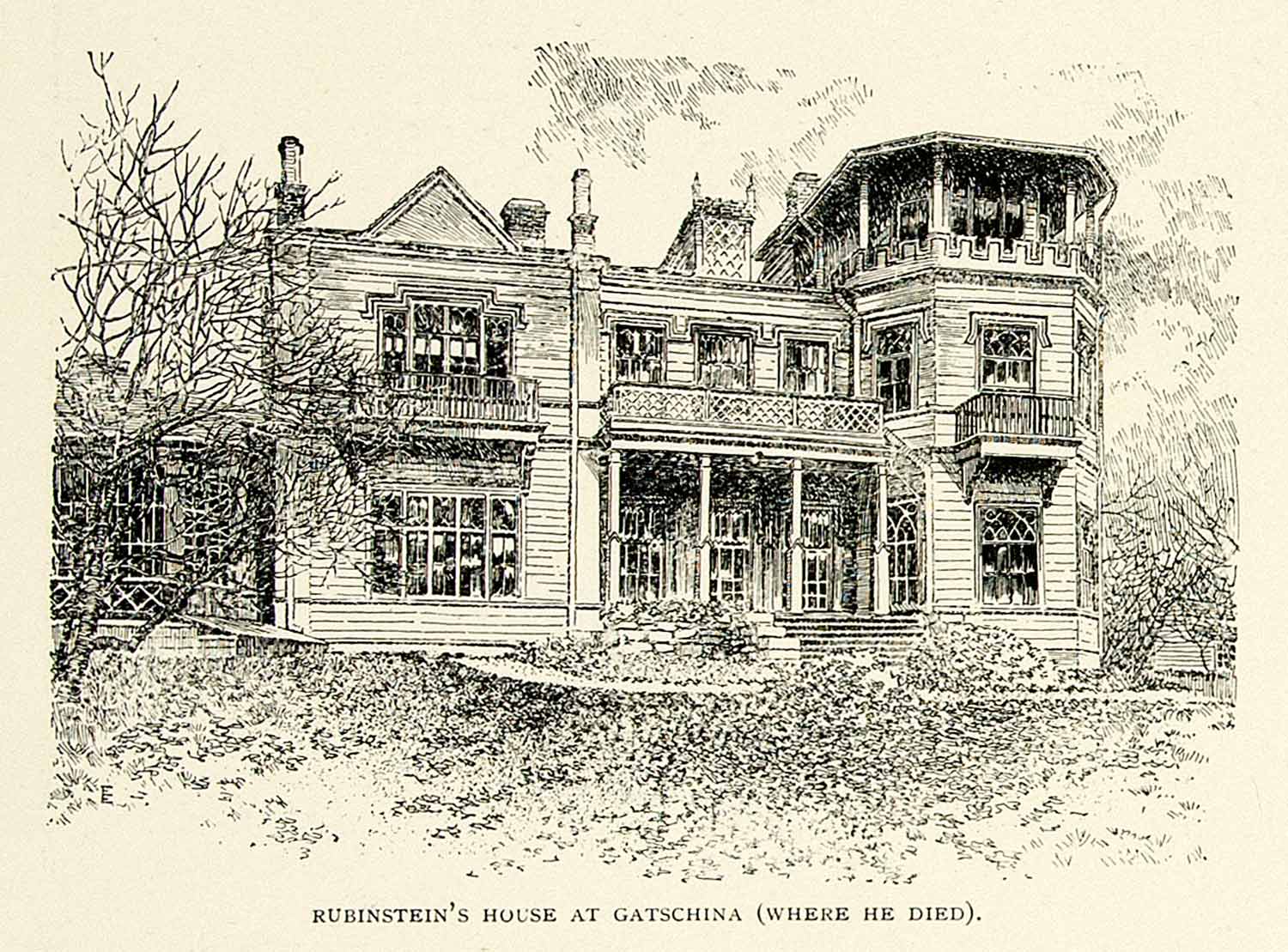 This is an original 1895 black and white relief line-block print of the home of Anton Rubinstein at Gatschina, Russia.