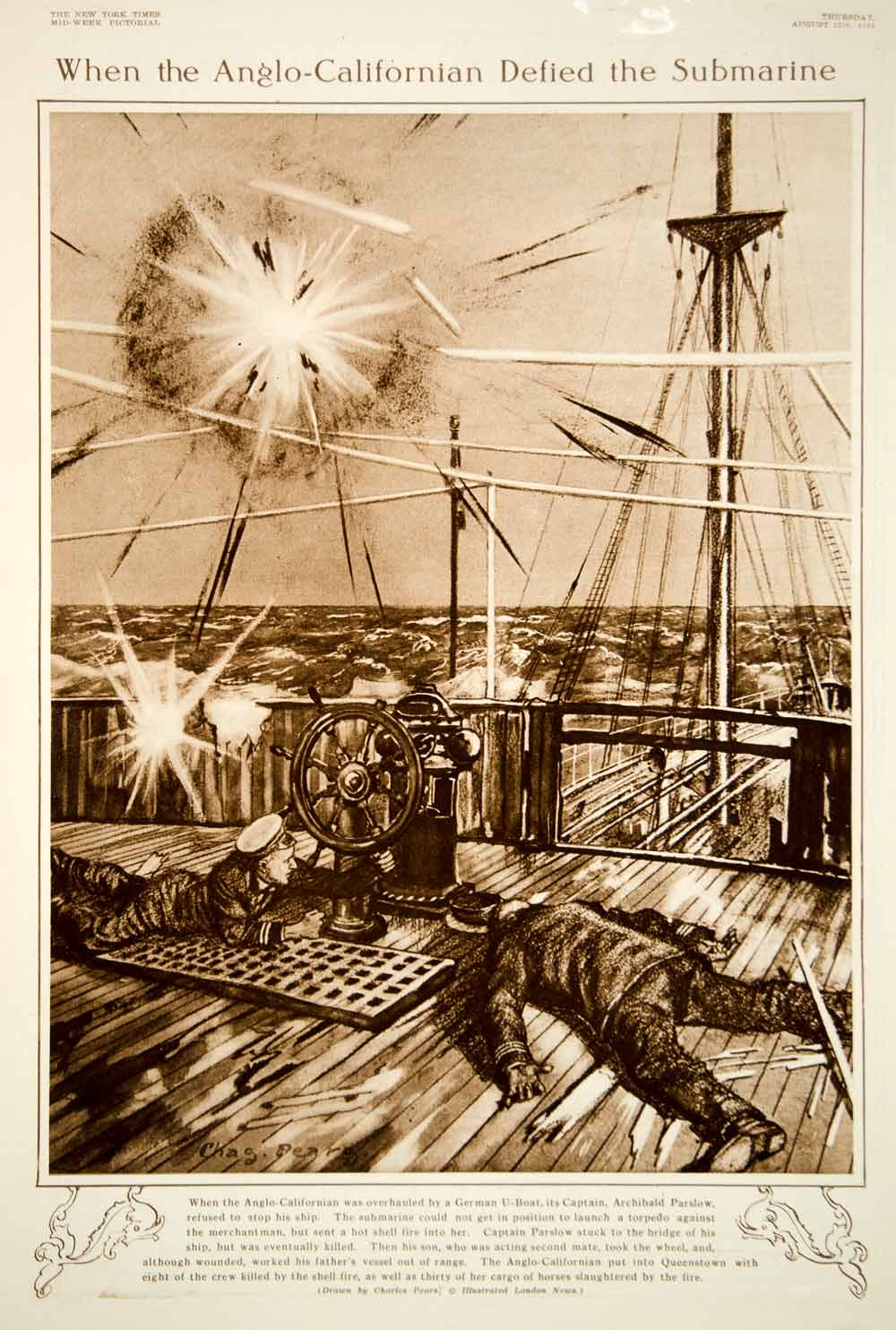 This is an original 1915 sepia rotogravure of a drawing by Charles Pears showing a German submarine attack on HM Horse Transport Anglo-Californian during World War I. Captain Parslow stayed on the bridge but was eventually killed. He was awarded the Victoria Cross for his heroism.