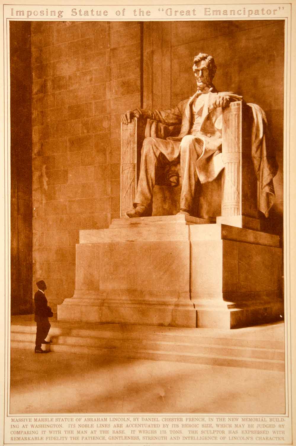 This is an original 1923 sepia rotogravure of the famous massive marble statue of Abraham Lincoln, sculpted by Daniel Chester French in 1920, located in the Lincoln Memorial in Washington D.C.
