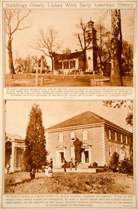 This is an original 1923 sepia rotogravure with images of two historic churches: St. John's Episcopal Church at 2401 East Broad Street in Richmond, Virginia. Built in 1741 by Colonel Richard Randolph, the church is famous as the location where Patrick Henry gave his fiery speech at the Second Virginia Convention, "give me liberty, or give me death!"; and Pohick Church, an Episcopal church in Lorton, Fairfax County, Virginia, noted for being the church in which George Washington worshiped.