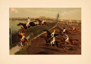 This is an original 1927 tipped-in Blackmore Tintex color print of the 1839 Grand Liverpool Steeplechase, which was the first official running of what would later be known as the Grand National. It was held at Aintree Racecourse, and although eighteen runners entered, one dropped out shortly before the event. A point of note is that this race had no handicap, all riders carried twelve stone. This scene depicts the riders at the third brook during the second round, including one rider whose horse took a tumble. The winner was Lottery, ridden by Jem Mason. The original drawing and engraving was done by Charles Hunt, a noted 19th century engraver.