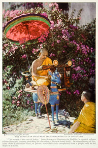 This is an original 1928 color print of a Cambodia priest teaching their neophytes the lessons of Buddha from a pulpit built in the shape of a horse to commemorate the traveling preacher himself, Guatama Buddha.