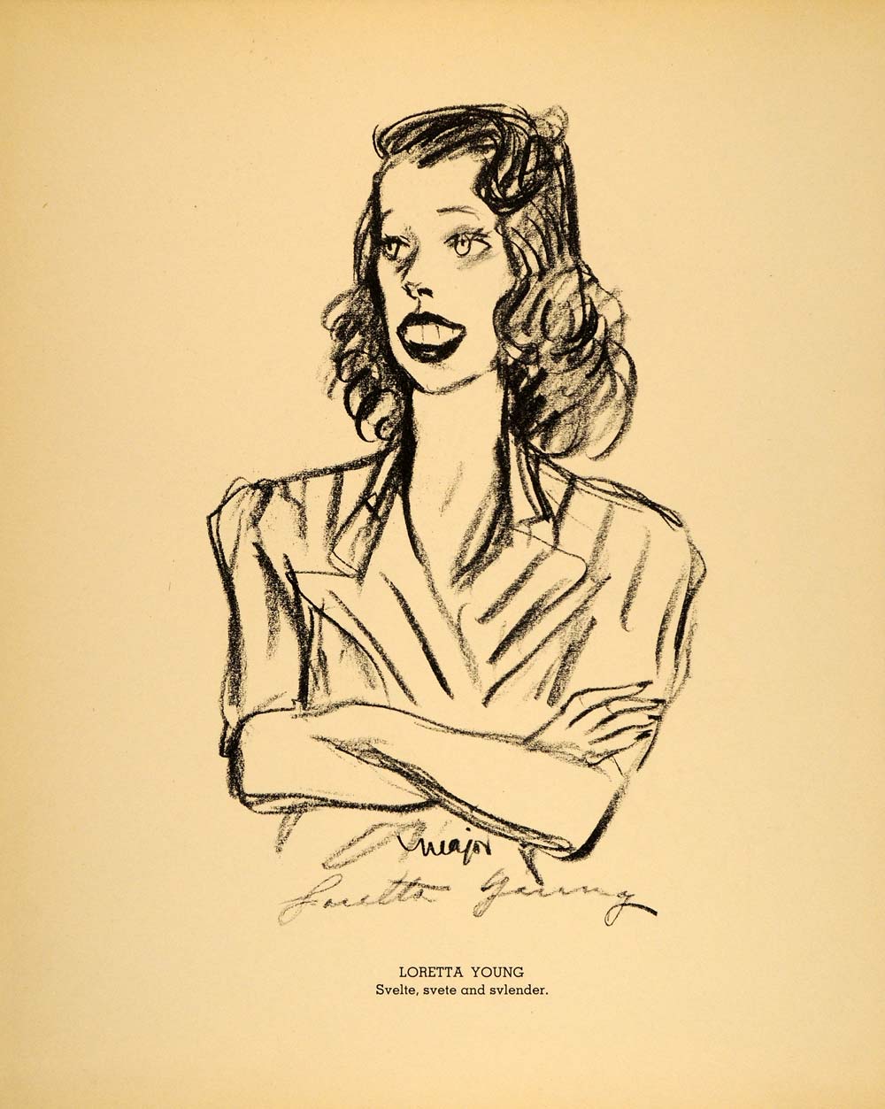 This is an original 1938 lithograph of a drawing by Henry Major, with a caption by humorist "Bugs" Baer, of film and TV actress Loretta Young (1913 - 2000).