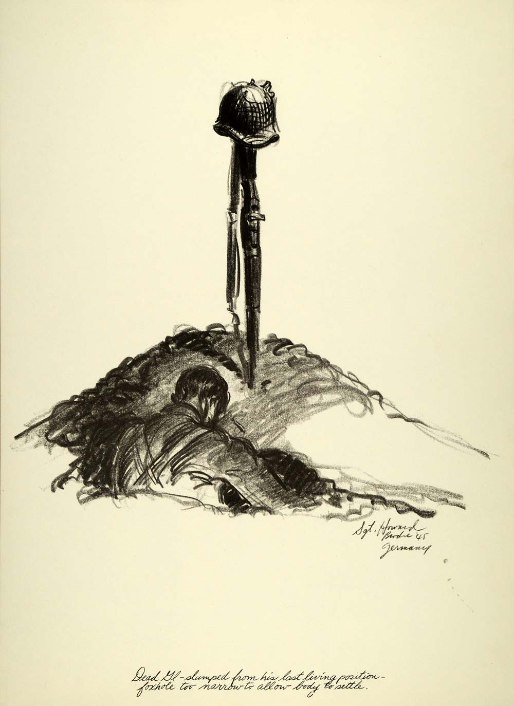 1963 Print Howard Brodie Art WWII Dead Soldier GI Front Line Foxhole Germany