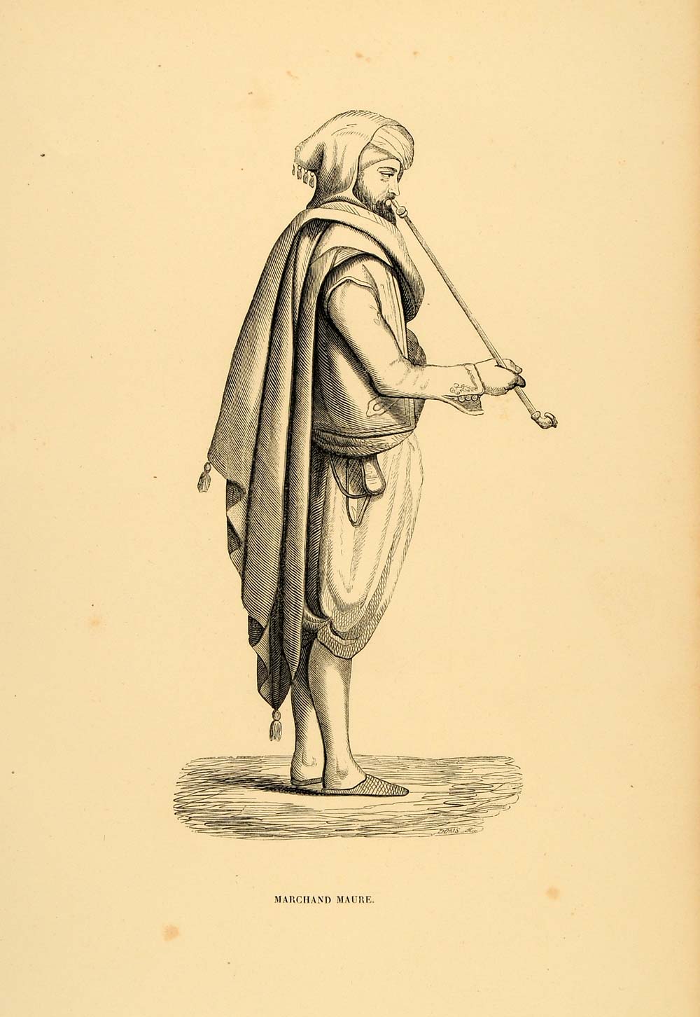 1844 Engraving Costume Man Moorish Merchant Africa Pipe - ORIGINAL CW3