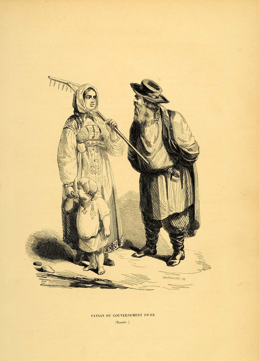 1844 Engraving Costume Russian Peasant Woman Child Tver - ORIGINAL CW4