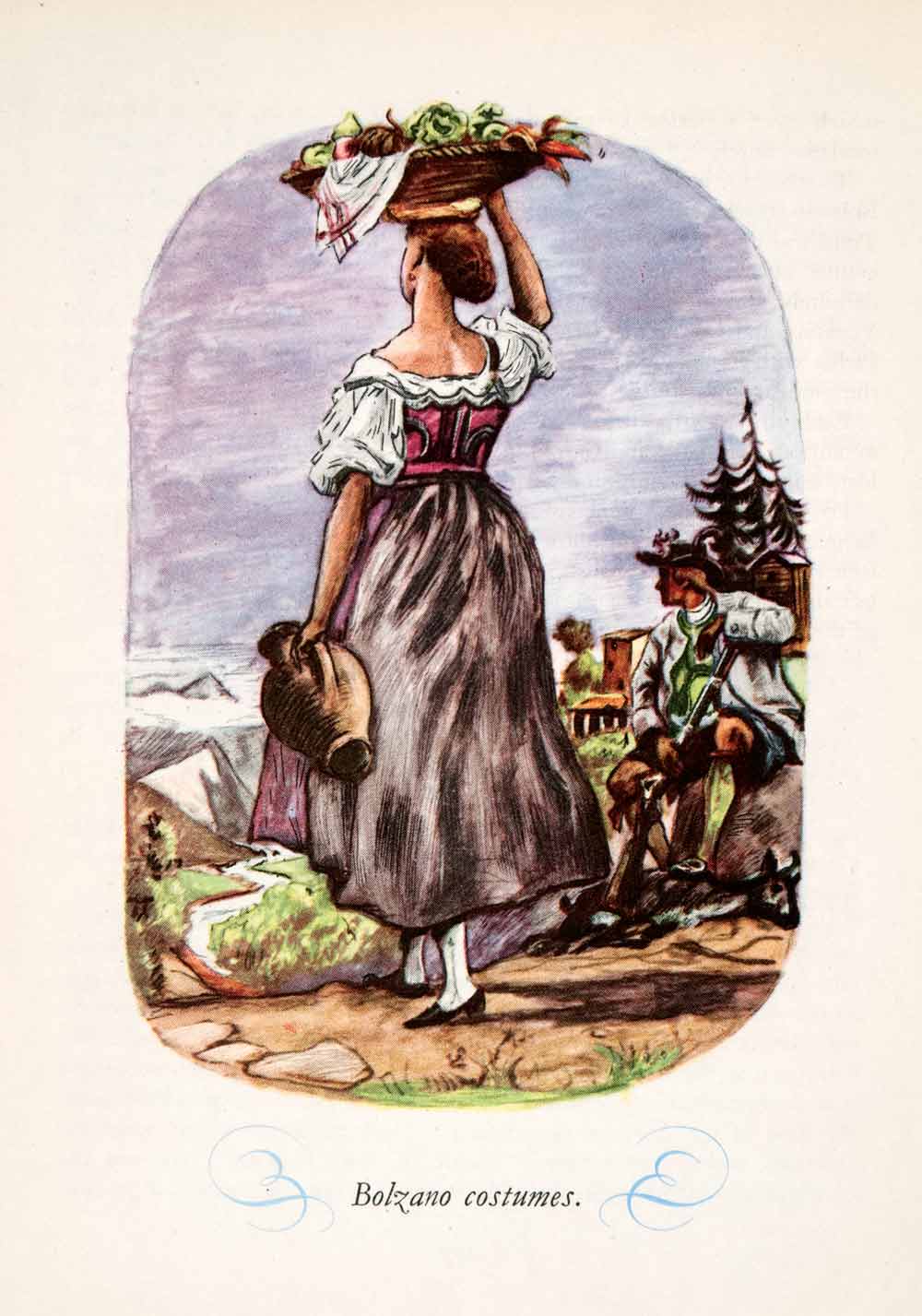 1950 Photolithograph Bolzano Costume Woman Italy Fashion Dress Basket XGHA2