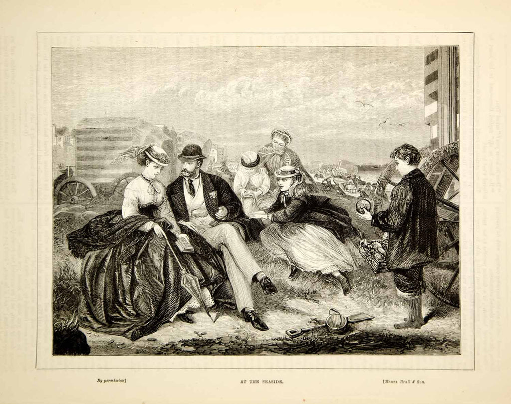 1876 Wood Engraving Antique Victorian Bathing Machine Box Seaside Outing TWW1