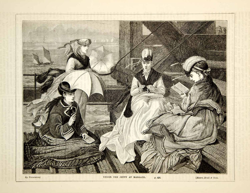 1876 Wood Engraving Antique Victorian Ladies Margate Pier Jetty England TWW1