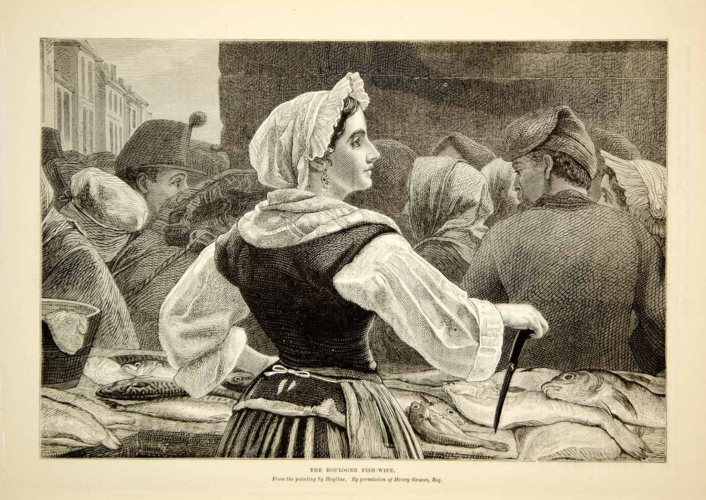 1876 Wood Engraving James Hayllar Boulogne Fishwife Fish Market Costume Art TWW1