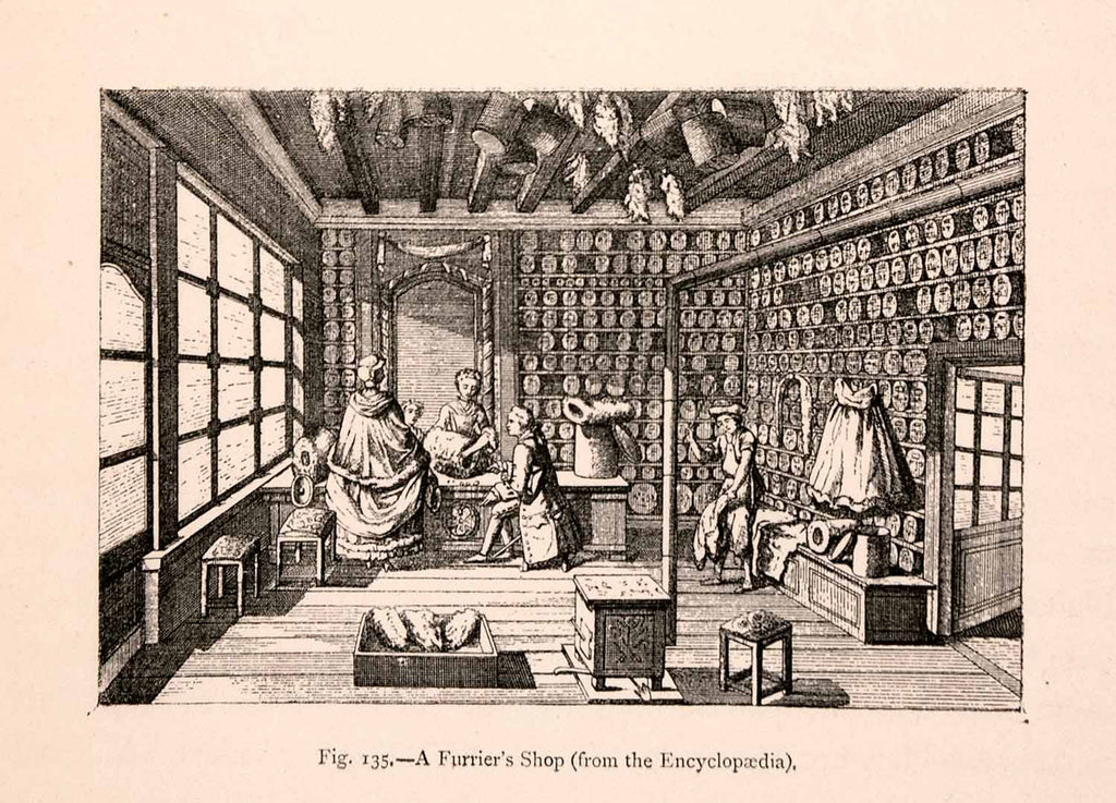 1876 Wood Engraving Furrier Shop Clock 18th Century France Genre Fashion XGGA9