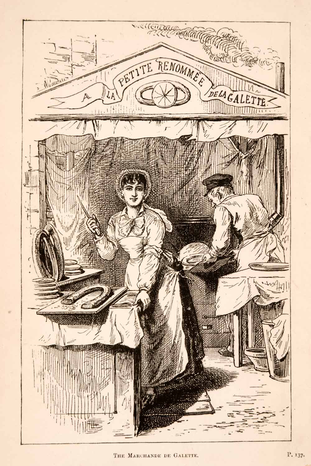 1882 Wood Engraving Paris Galette Street Vendor Costume Cake 19th Century XGNA8