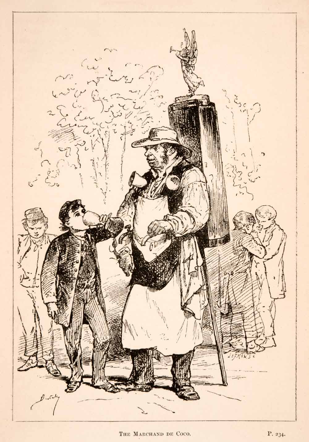 1882 Wood Engraving Hot Chocolate Street Vendor Paris Costume Child XGNA8