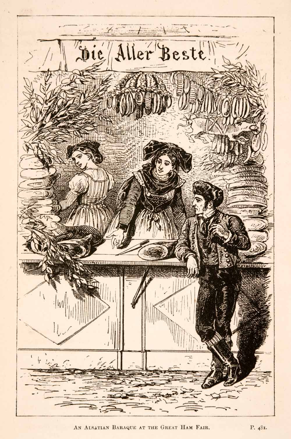 1882 Wood Engraving Eastertide Ham Fair Alsatian Booth Costume Vendor XGNA8