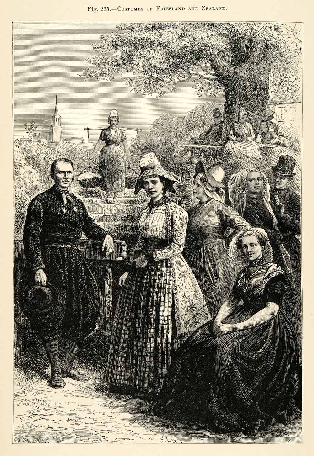 1882 Wood Engraving Costume Friesland Zealand Dress Traditional Hat XGS6