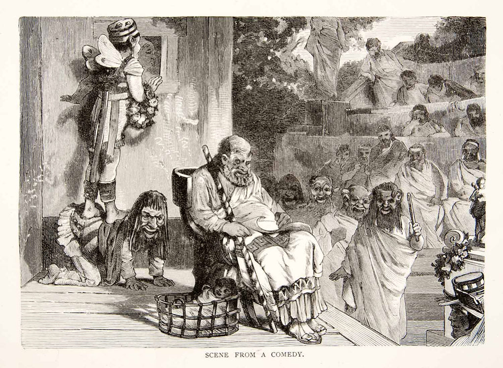 1886 Wood Engraving Comedy Theatre Theater Mask Costume Ancient Greece XGHC6