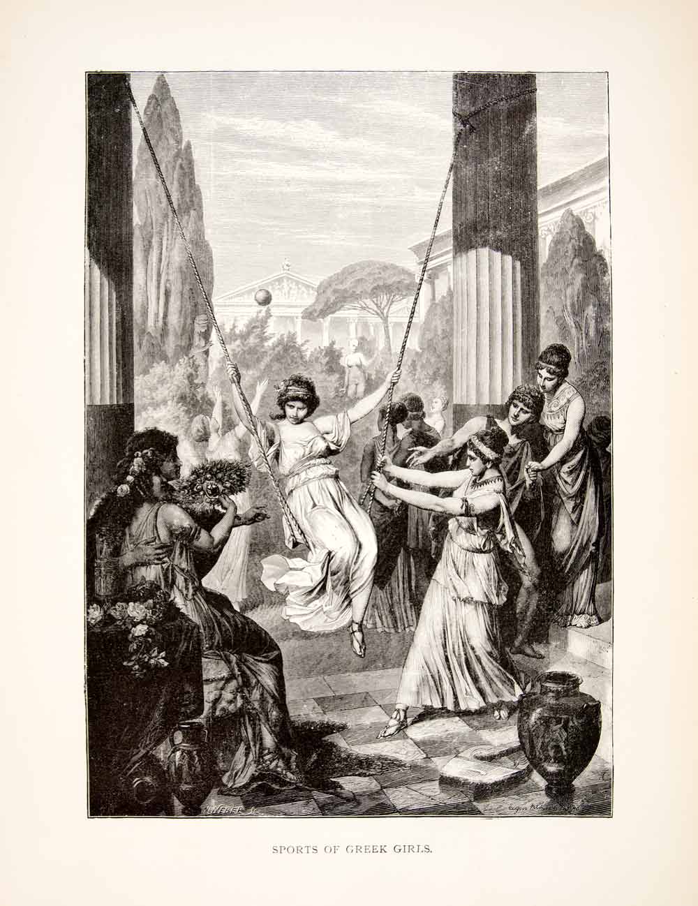 1886 Wood Engraving (Photoxylograph) Greece Girl Swinging Sport Greek XGHC6