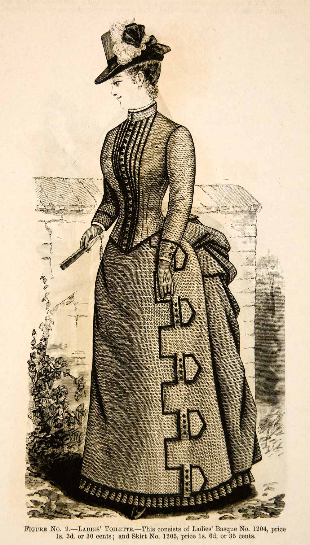 1886 Wood Engraving Fashion Costume Clothing Victorian Woman Dress Hat Fan YDL1
