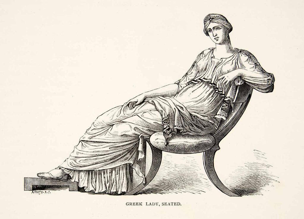 1886 Wood Engraving Greek Woman Lady Chair Toga Costume Crown Seated Dress XGHC6