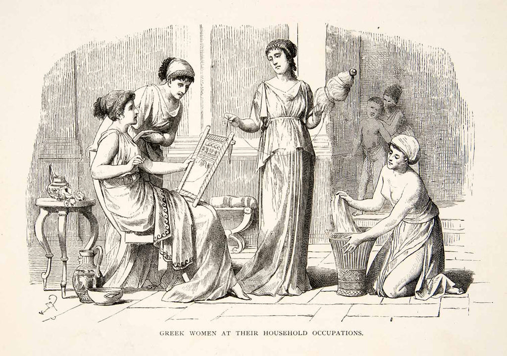 1886 Wood Engraving Greek Women Costume Dress Toga Embroidery Spinning XGHC6