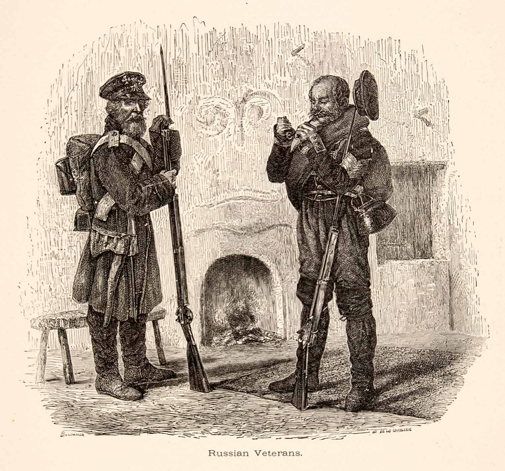 1886 Wood Engraving Russian Veterans Soldiers Uniform Costume Guns XGHC7