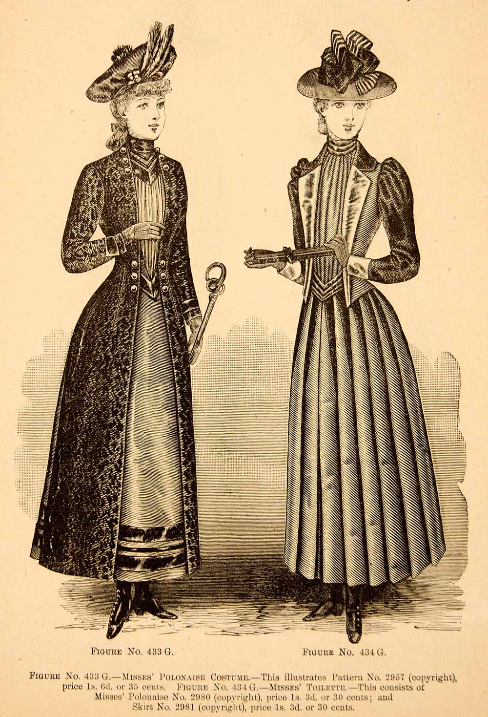 1889 Wood Engraving Fashion Dress Victorian Women Clothing Costume Hate YDL7