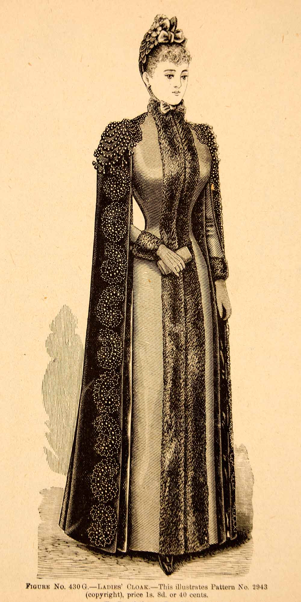 1889 Wood Engraving Fashion Clothing Victorian Ladies Cloak Coat Costume YDL7