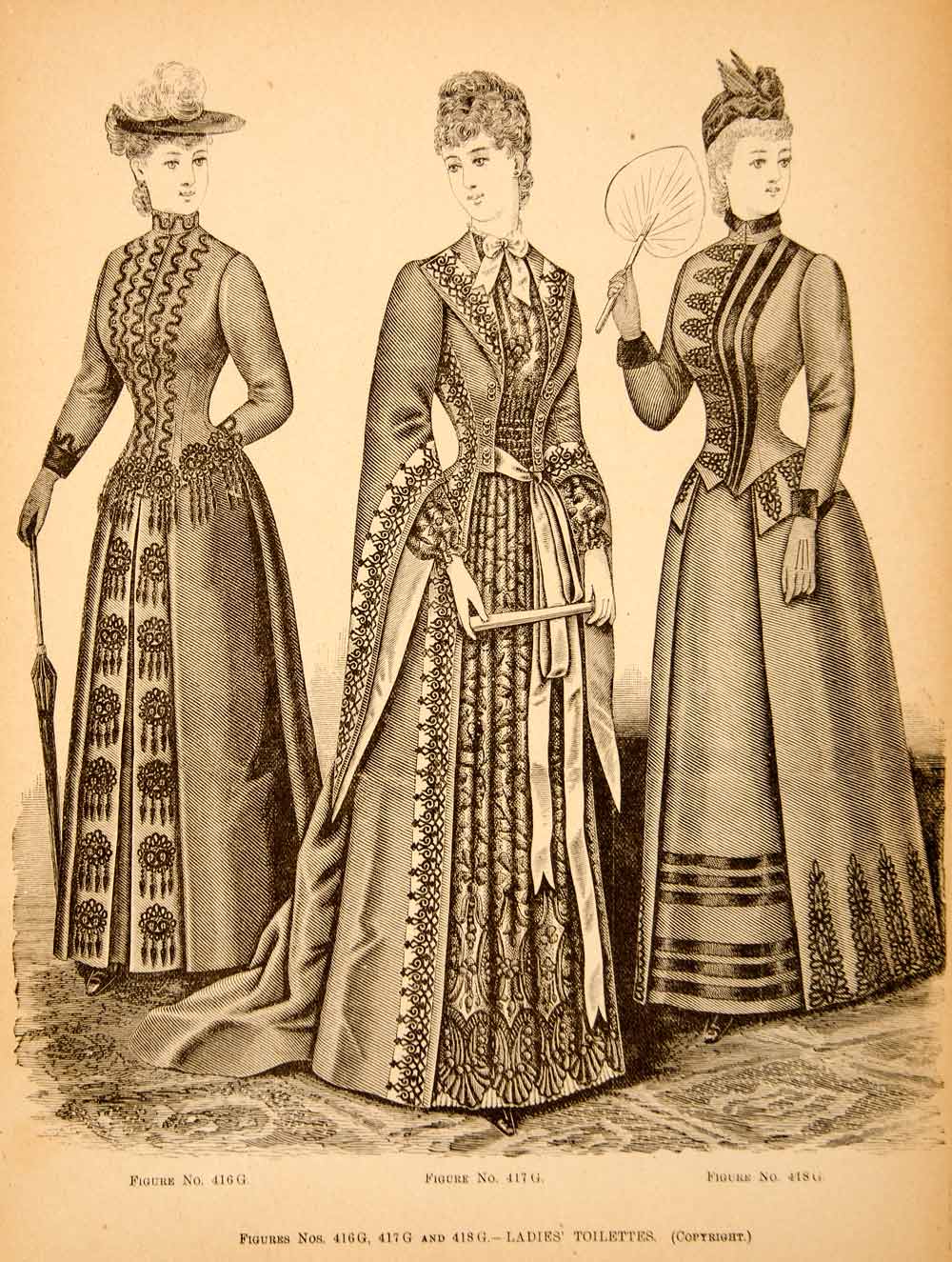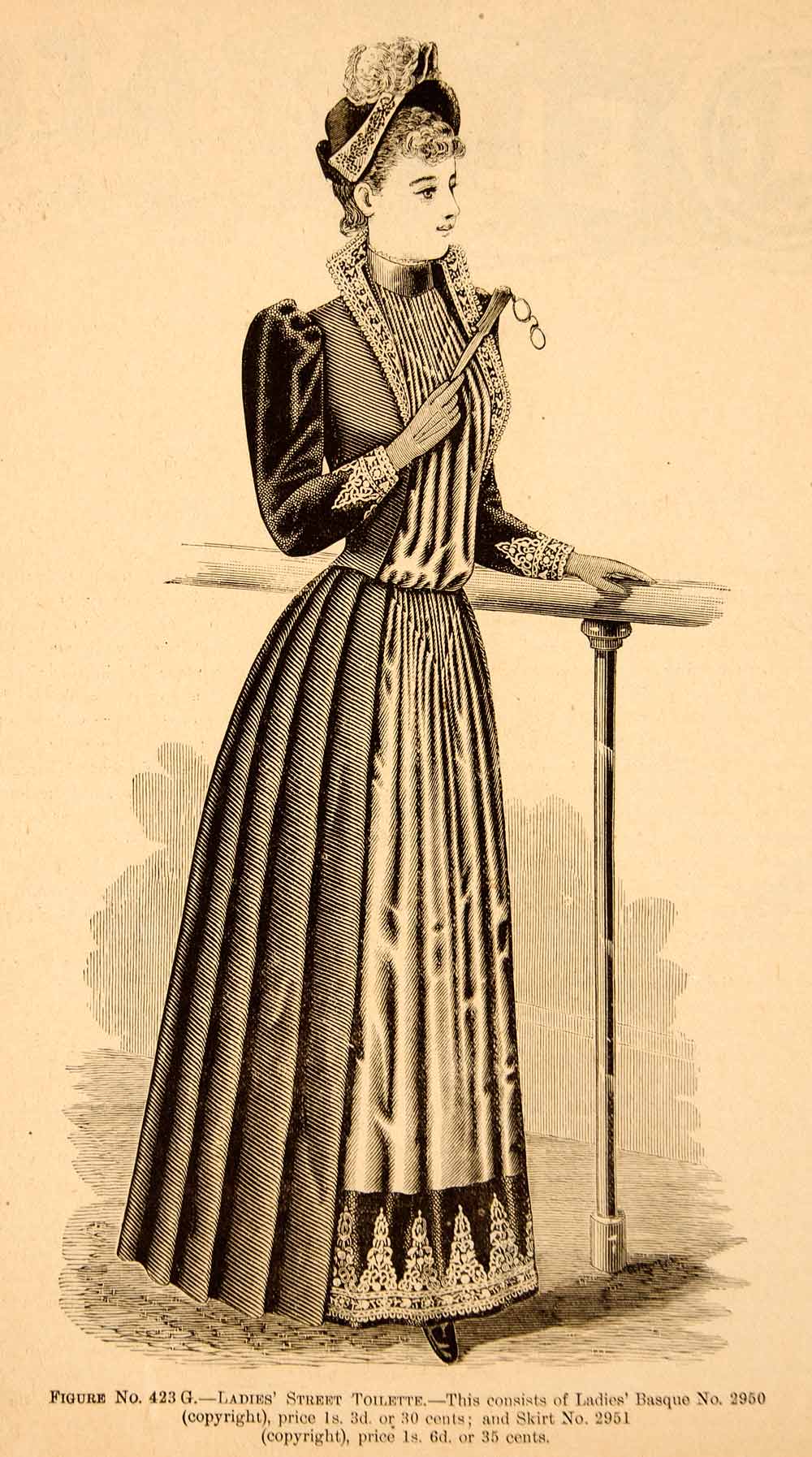 1889 Wood Engraving Fashion Victorian Women Waist Fan Clothing Costume YDL7
