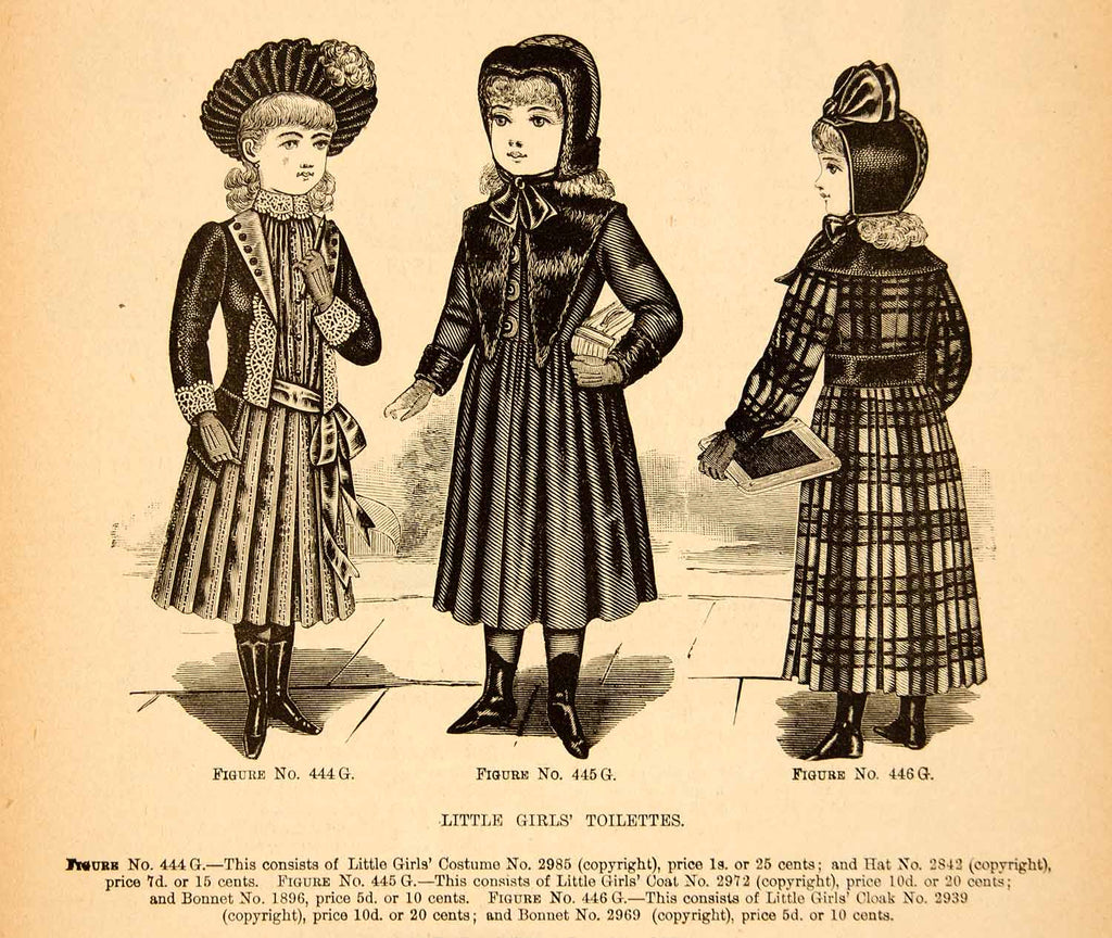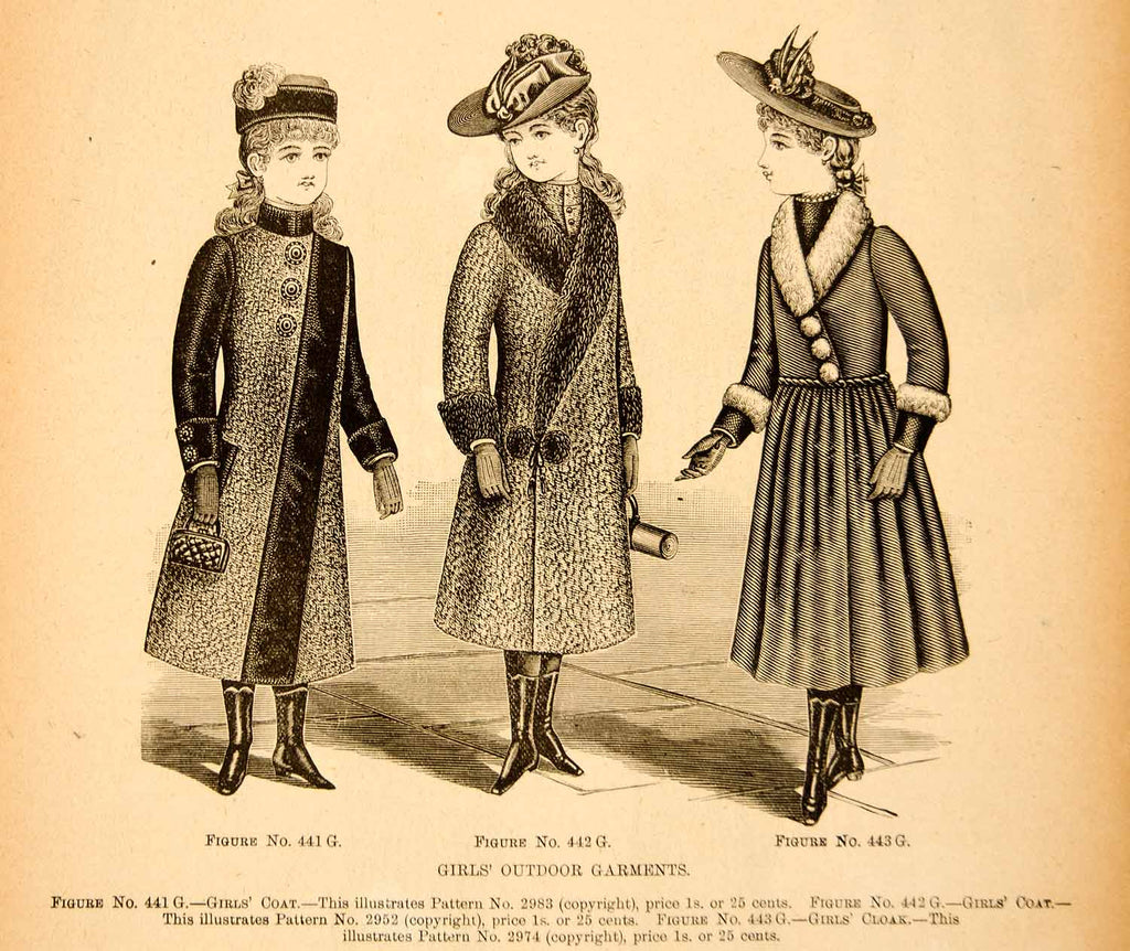 1889 Wood Engraving Victorian Girls Costume Clothing Fashion Coat Cloak YDL7