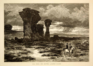 This is an original 1873 black and white in-text wood engraving of an illustration by Thomas Moran of the Dial Rock, an unusual rock formation of the Red Buttes in the Laramie Plains of south central Wyoming.