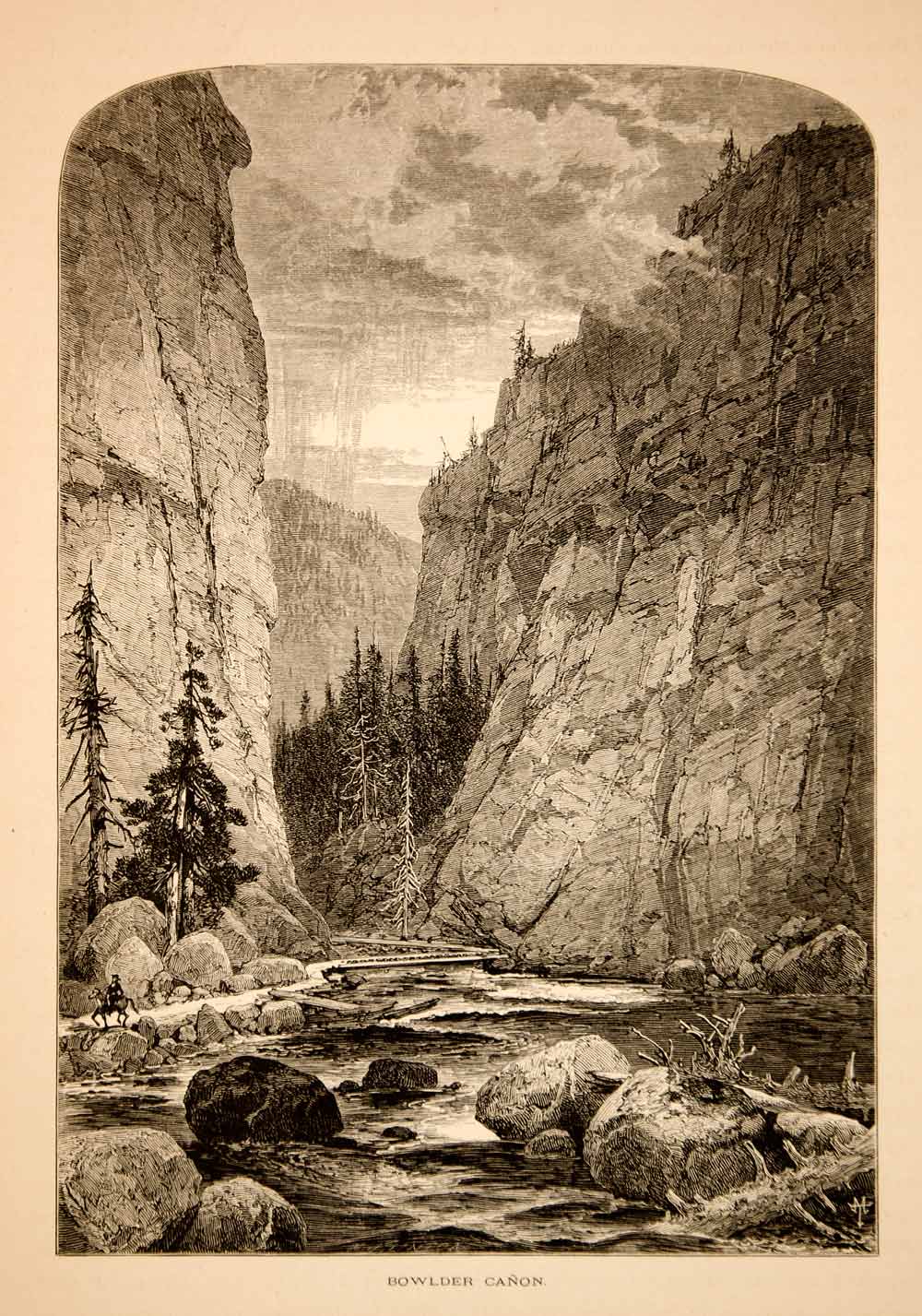 This is an original 1874 black and white in-text wood engraving of an illustration by Thomas Moran of Boulder Canyon in the Rocky Mountains.