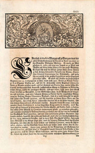 Period Paper is pleased to offer an extremely rare and impressive early eighteenth century collection of biographies and portrait engravings and etchings, produced in Leipzig, Germany in 1721 and 1722. Included are notable monarchs, rulers, religious figures, and members of notable Houses throughout Europe, including several genealogical charts of dynastic lines, spanning the sixteenth to early eighteenth centuries. The collection is comprised of exquisitely engraved and etched copper portrait plates framed by varying decorative motifs, all engraved by Johann Friedrich Rosbach. Many of the portraits include separate biographical pieces ranging in length from a single paragraph to several pages for more notable European monarchs and emperors. If present, the accompanying text is in German and is composed of beautiful woodcut text, with most pages containing elegantly etched drop cap initials, head-and tail-pieces and vignettes. The superb, folio-sized stock upon which the collection is engraved and etched employed the latest advances in eighteenth century paper making and highlights the era's predilection for strong, lightly sized paper with a fine structure and smooth surface. The paper's characteristics are thus similar to Japanese Gampi, and the result is well-preserved and crisp images that exceptionally capture Rosbach's fluid and sharp line work. This collection represents a unique opportunity to collect a valuable part of European history stunningly composed and illustrated.