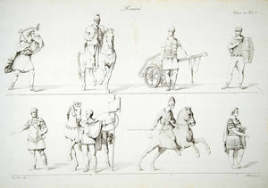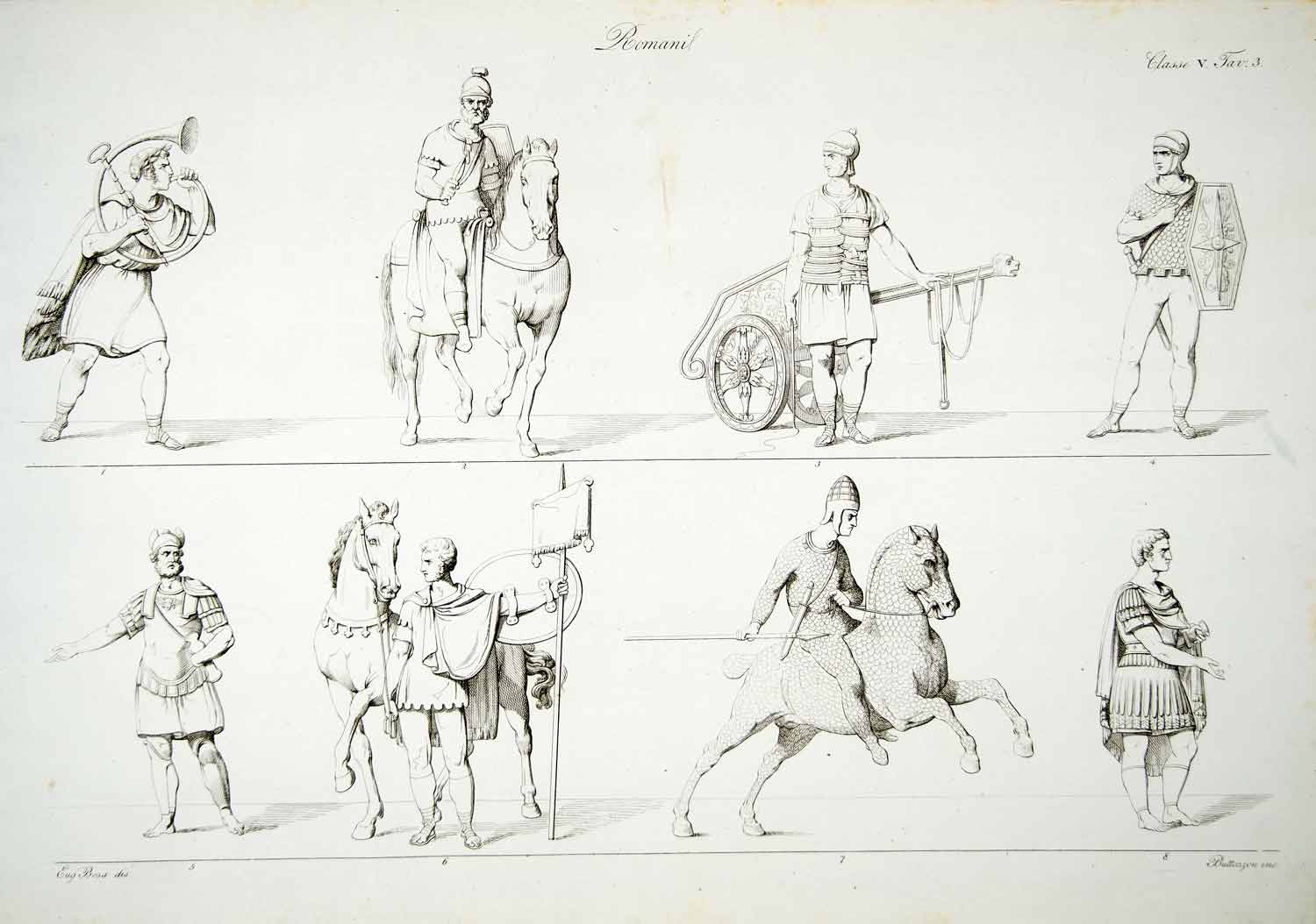 This is an original 1833 black and white copper engraving of an illustration by Eugenio Bosa of the military costumes and armor of ancient Rome, including a buccinator playing the buccina, Roman soldiers and legionnaires, heavy cavalry, and a tribune.