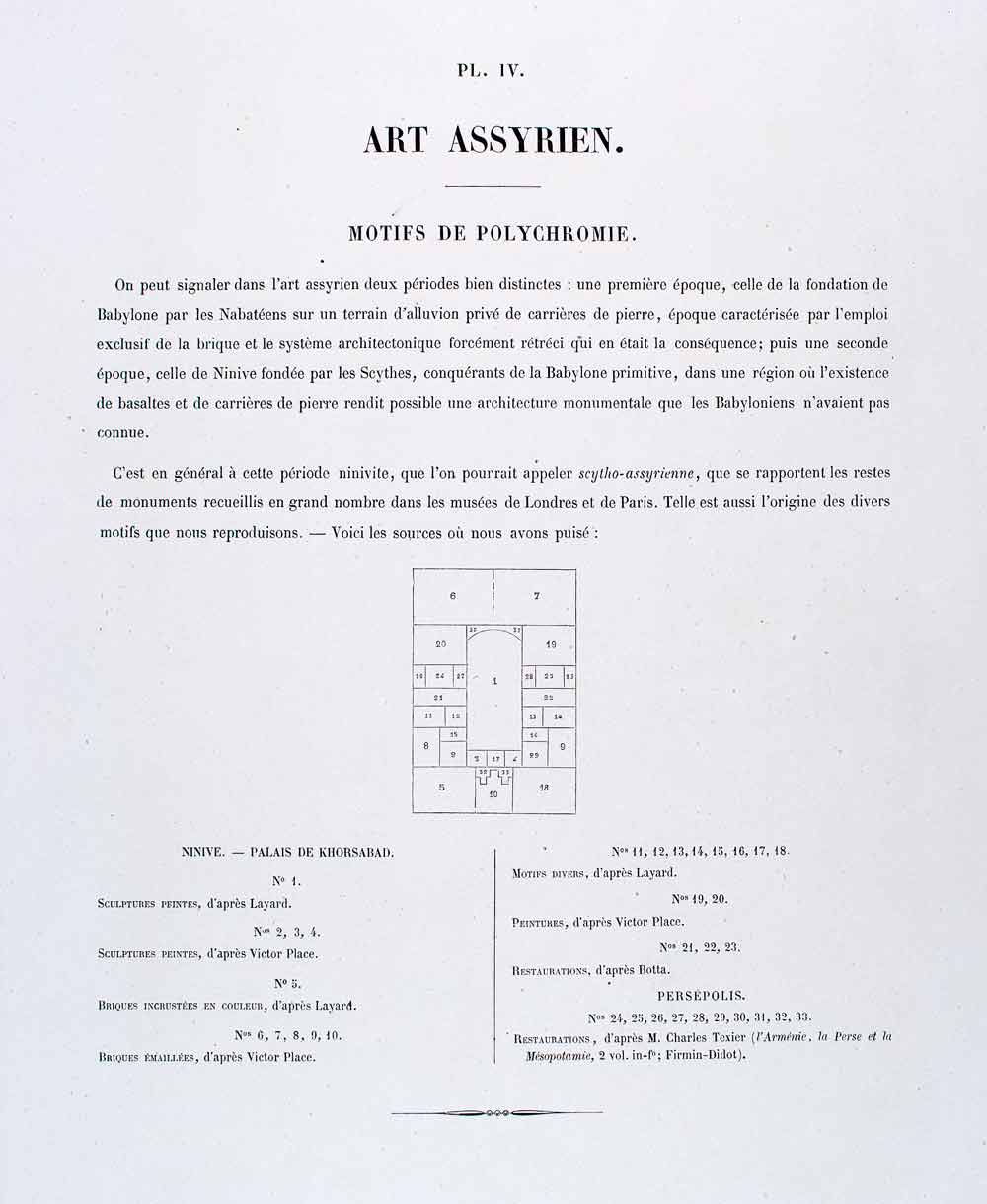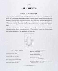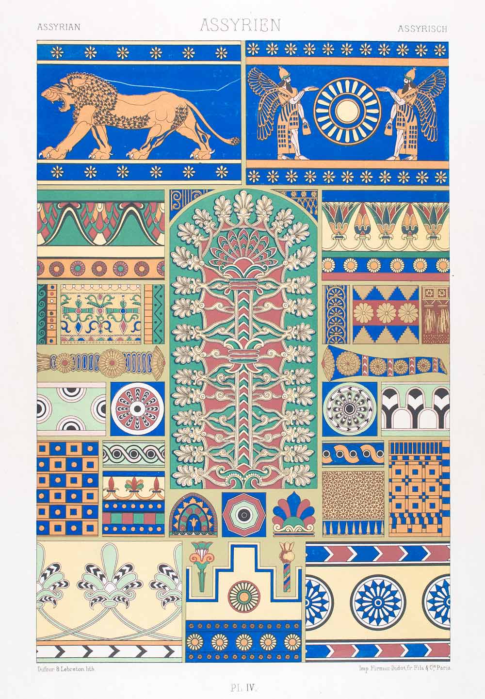 This is an original 1875 color chromolithograph that depicts a variety of Assyrian patterns and motifs taken from various historical landmarks, including Persepolis. The additional image provides more detail about the origins of these designs.