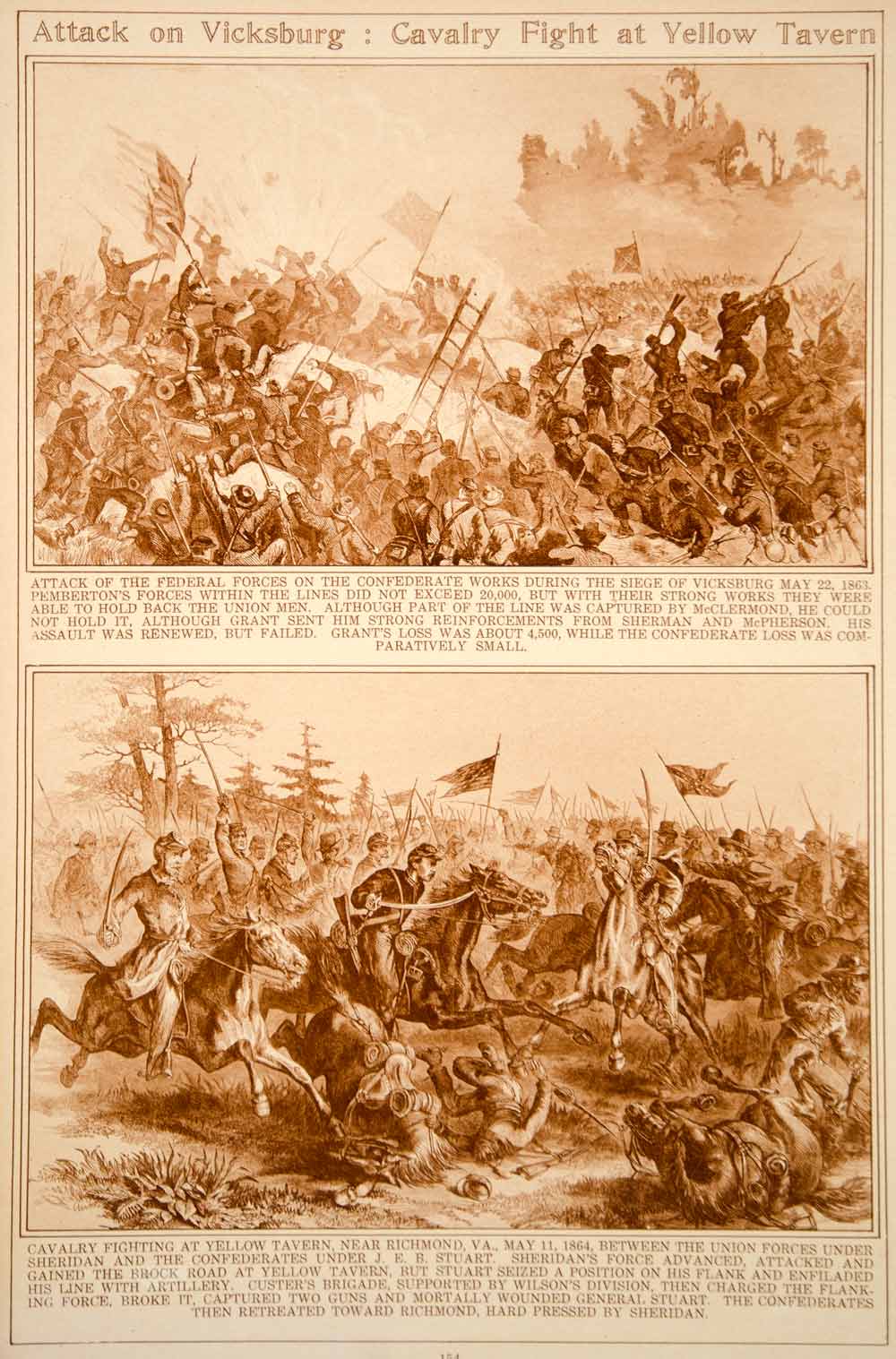 This is an original 1923 sepia rotogravure with illustrations of two scenes during the American Civil War or the War Between the States: the attack of Union soldiers during the Siege of Vicksburg on May 22, 1863; and the cavalry battle at Yellow Tavern near Richmond, VA on May 11, 1864.