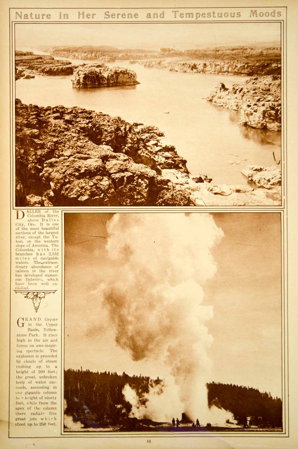 This is an original 1923 sepia rotogravure with two views of western landscapes: the Dalles of the Columbia River; and Grand Geyser in the Upper Geyser Basin of Yellowstone National Park.