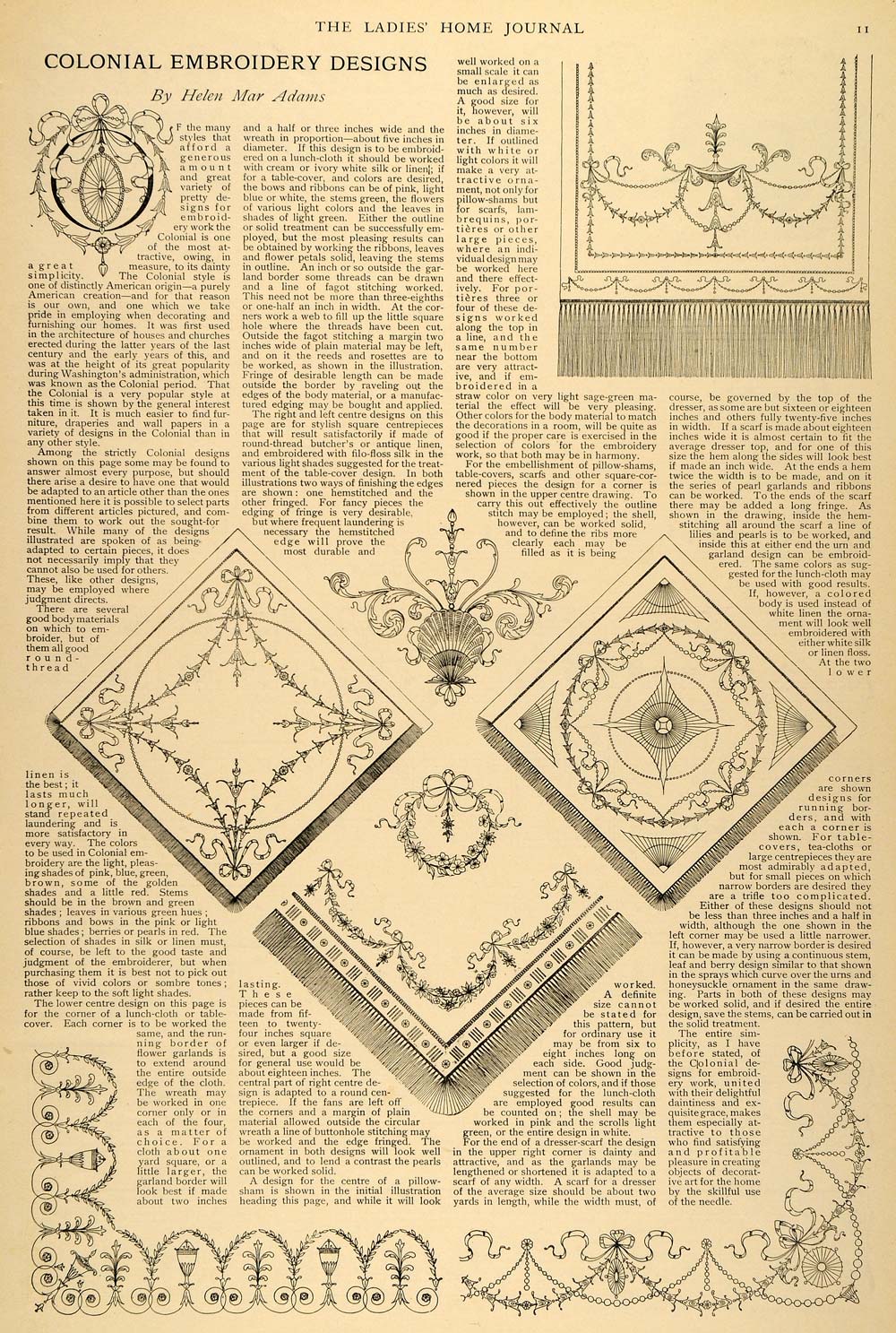 This is an original 1895 1 page article by Helen Mar Adams, featuring Colonial Embroidery Designs.