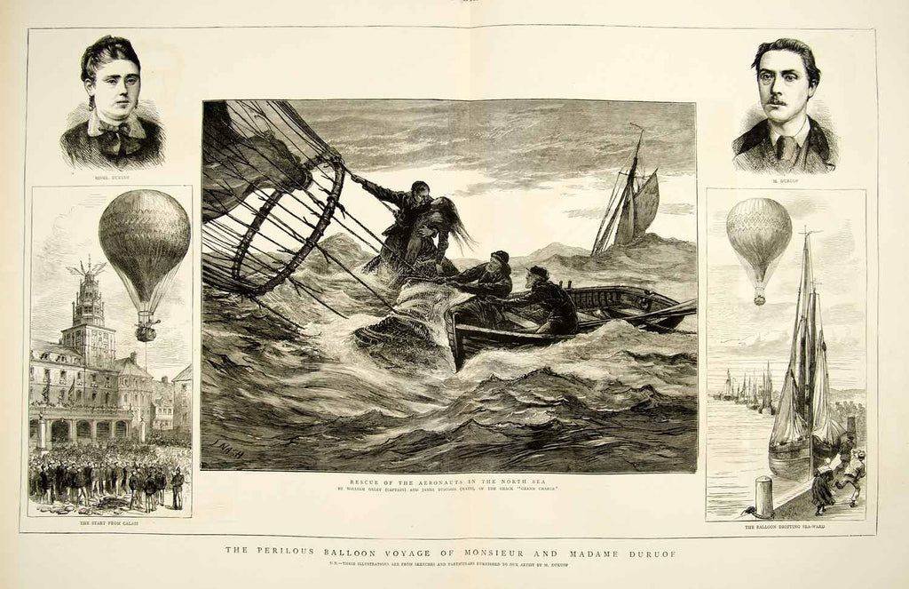 1874 Wood Engraving Joseph Nash Art Claude Jules Duruof Hot Air Balloon YTG9