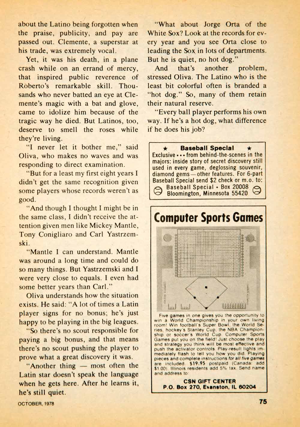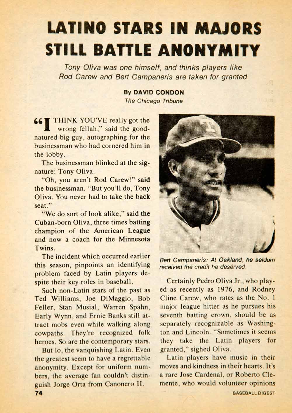 Keywords specific to this image: Athlete, Major Leagues, Professional, Player, Portrait, Uniform, Hispanic, Journalism, All Star, Tony Olivia, Rod Carew, David Condon, Chicago Tribune, Minnesota Twins, Jorge Orta, Chicago White Sox, Cuban American, Oakland Athletics, Texas Rangers, Shortstop