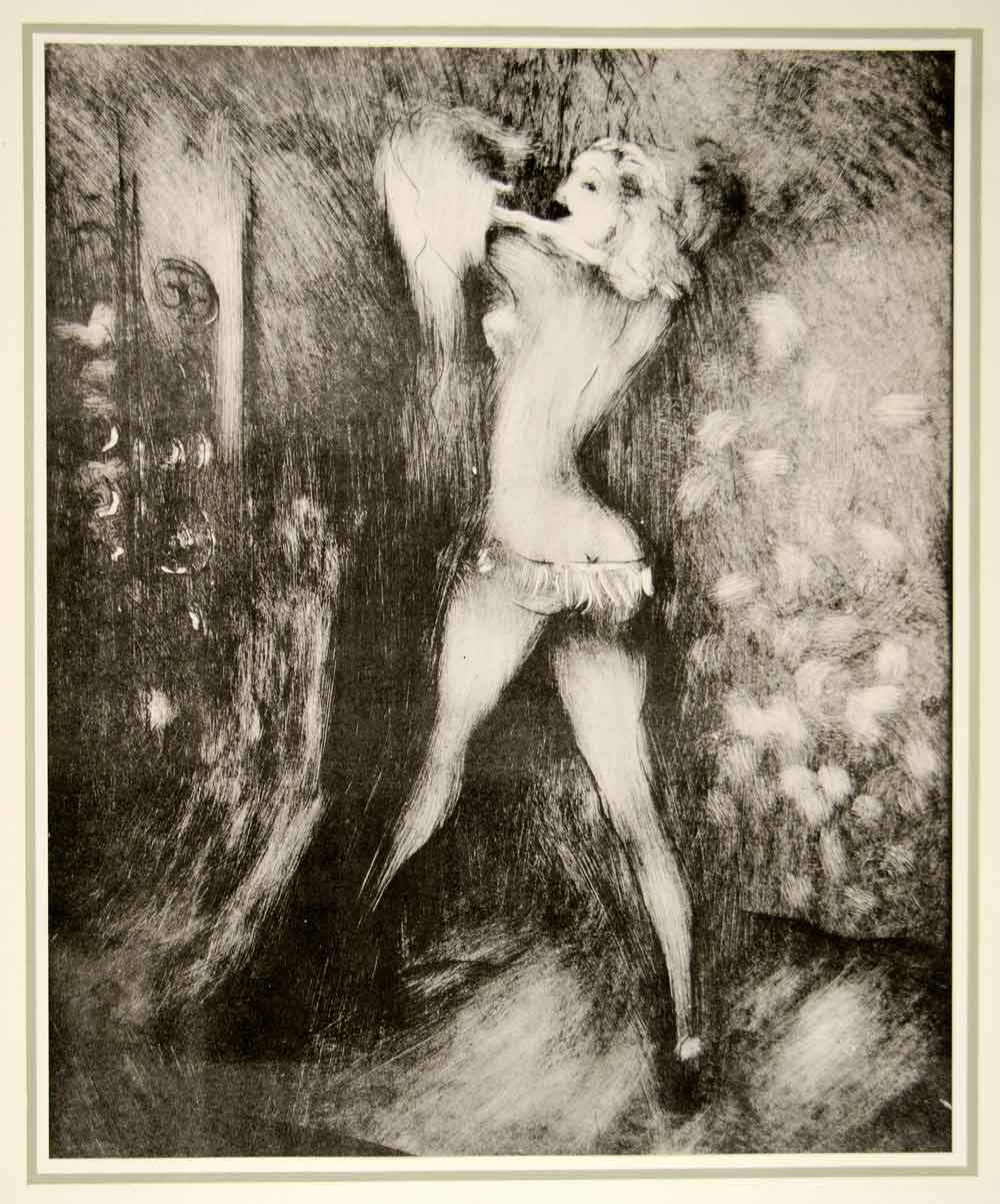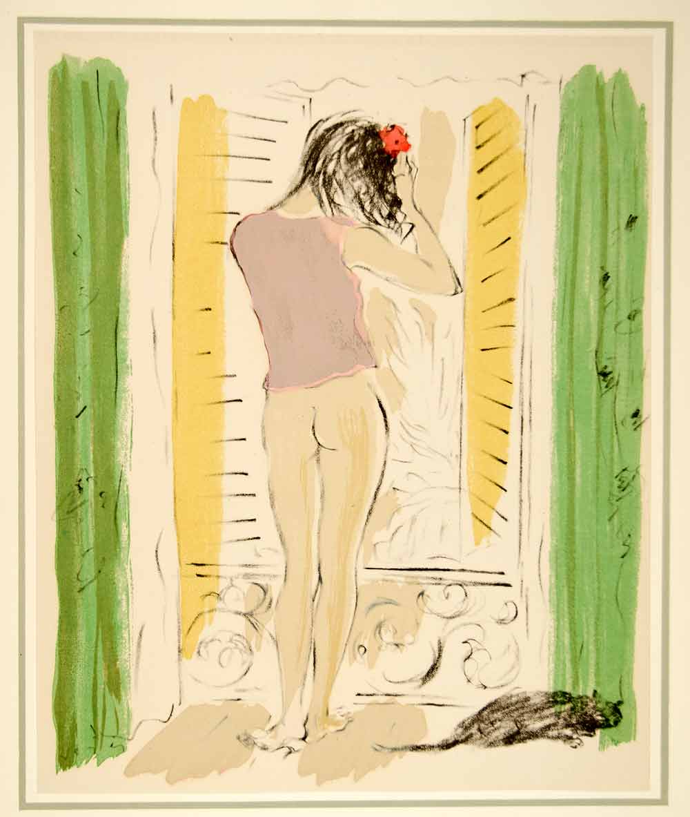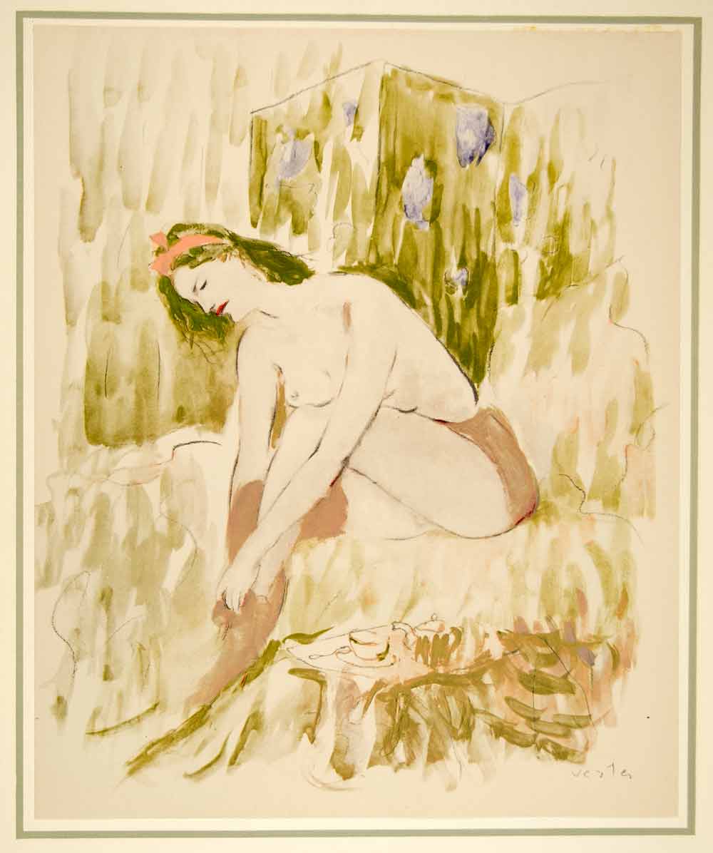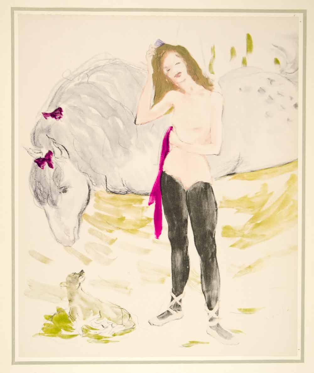 A stunning collection of large-format, tipped-in, hand-colored original lithographs of women, in various poses, by the Hungarian-born painter, illustrator, and costume designer, Marcel Vertès (1895 -1961). Unique to this collection from Vertés is his nude illustration style and the consistent them of dance as well as his use of animals (domestic and farm). This collection is number 1680 from a limited edition of 1750 and is printed on paper specially made by Henry Lindenmeyr & Sons. In excellent condition, each folio-size print is ready to frame. In each product listing we have provided two images of each lithograph: a closeup and a second image showing the border area of the mounting board.