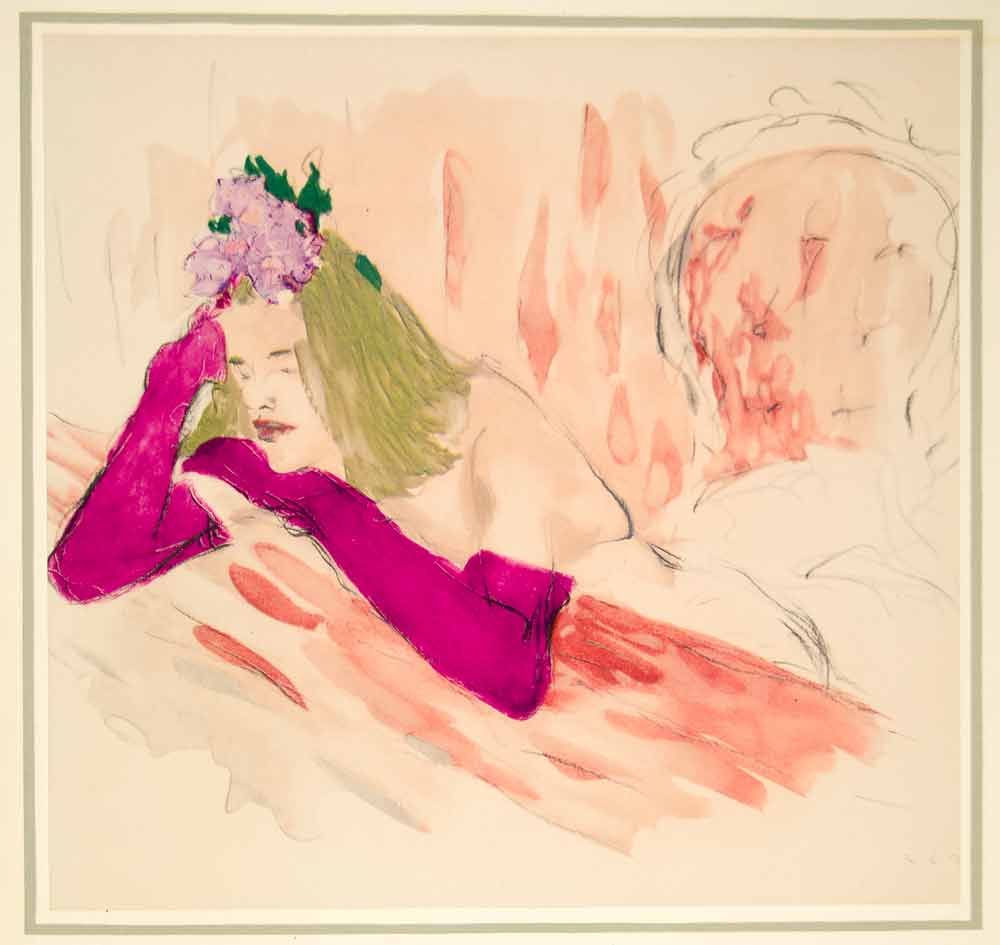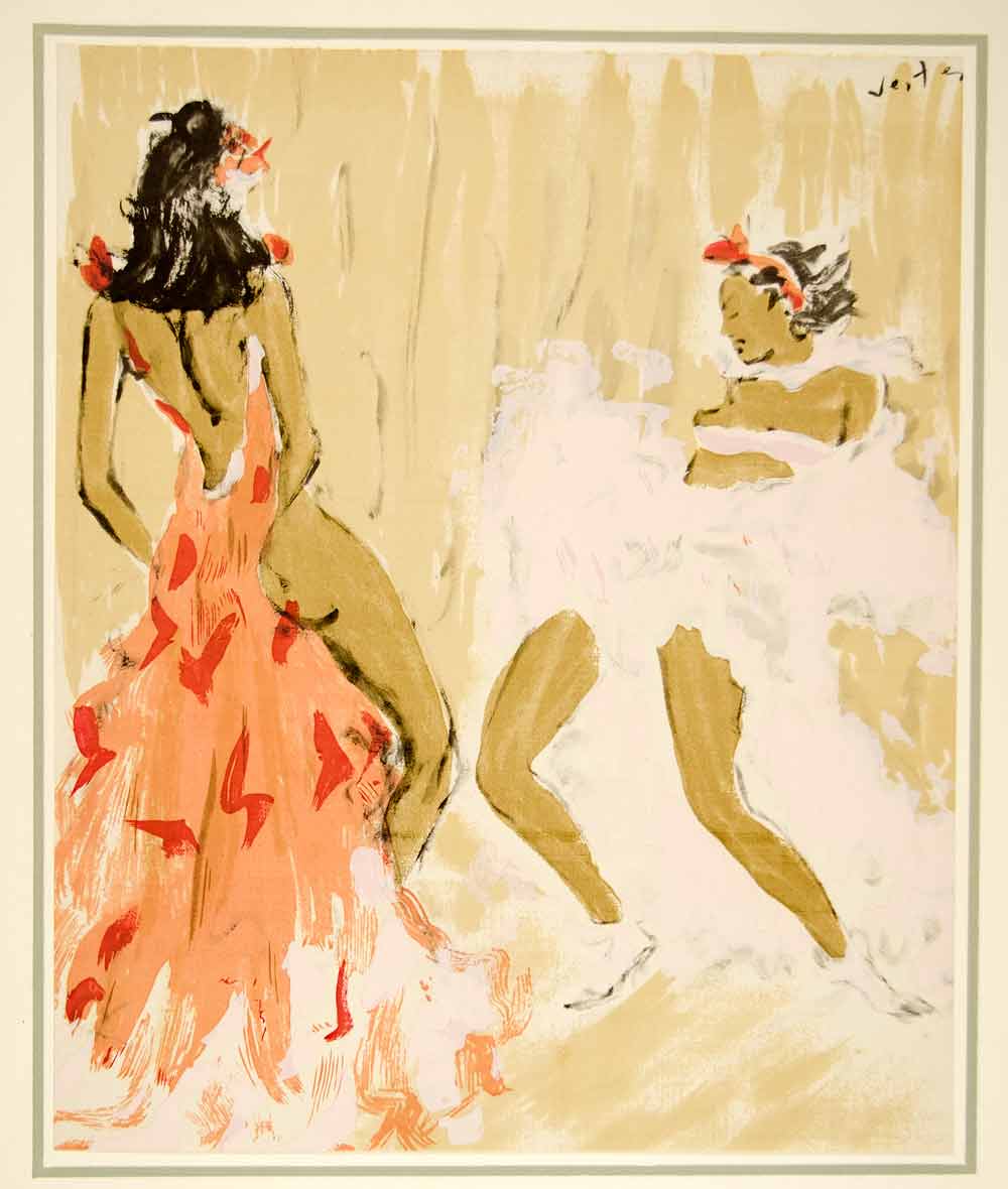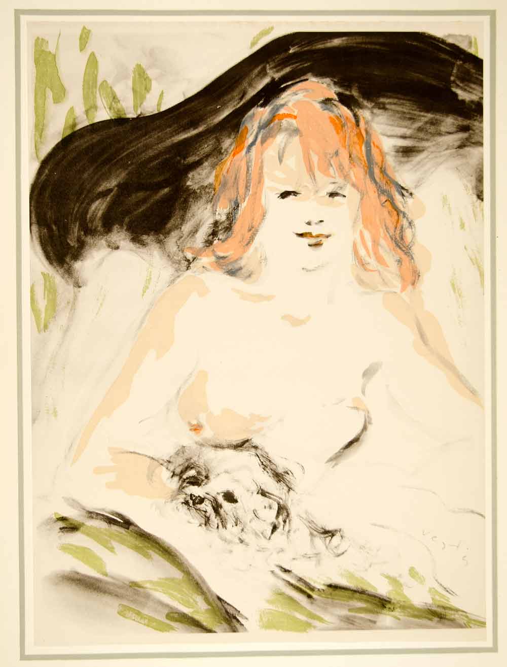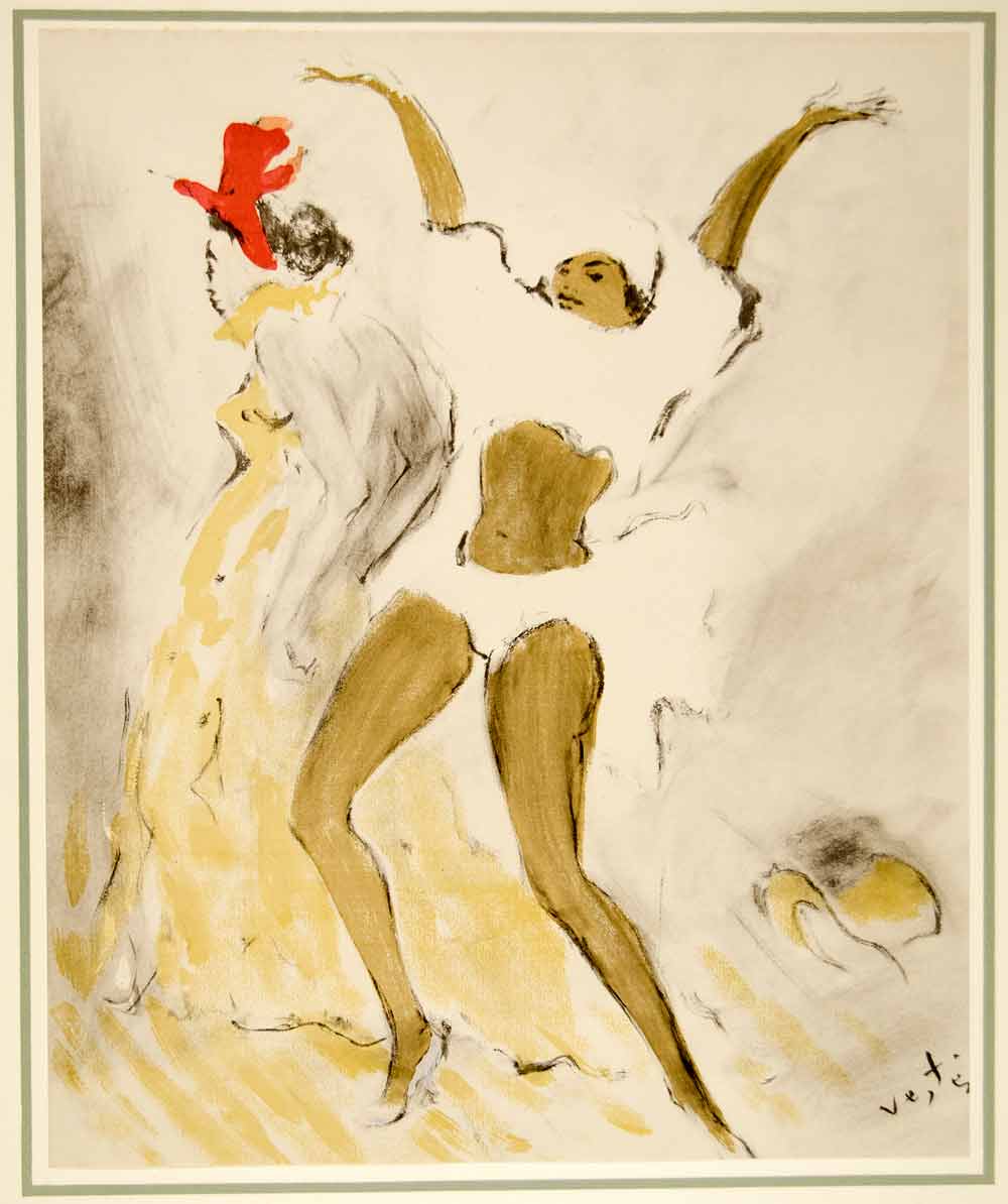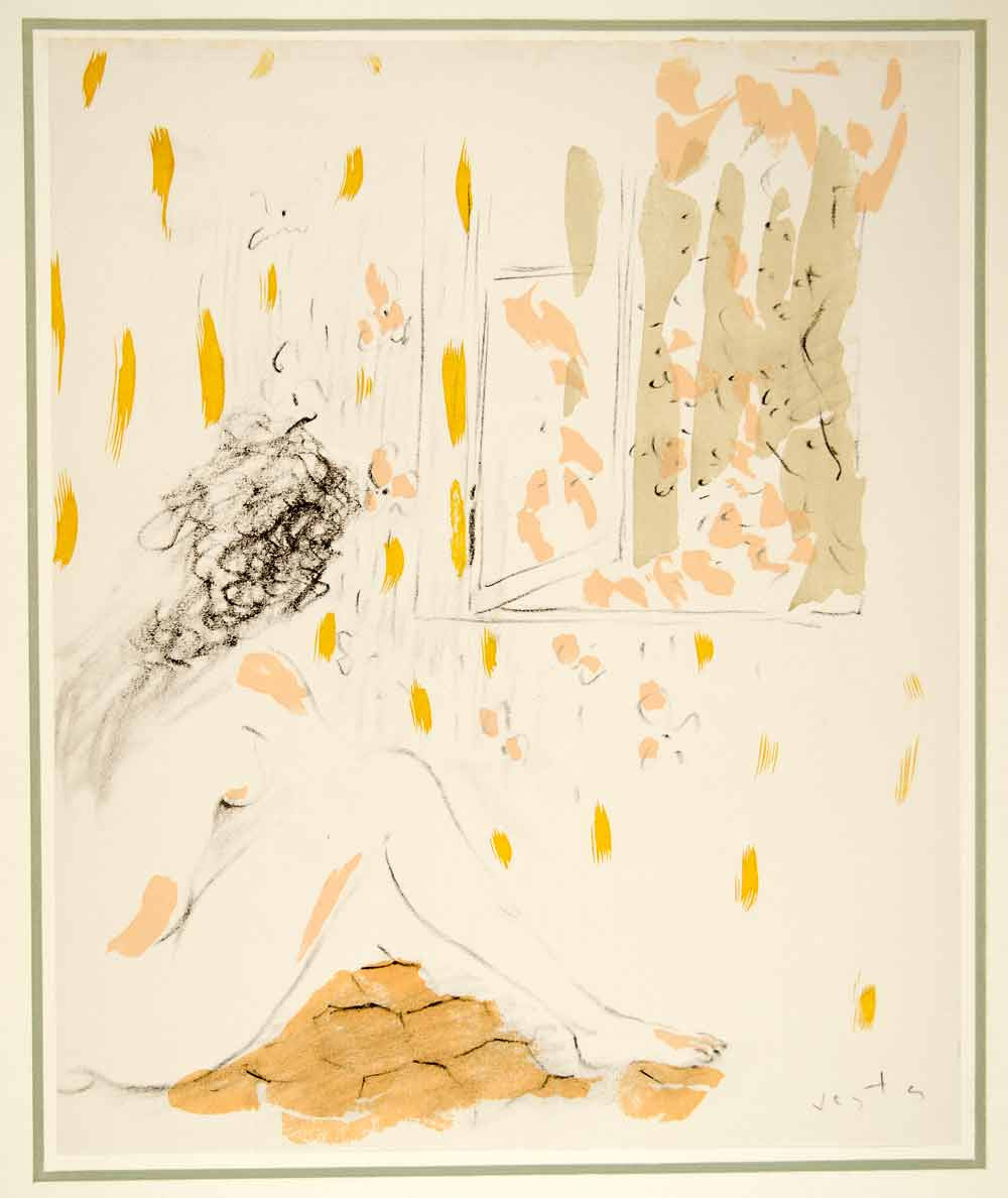 A stunning collection of large-format, tipped-in, hand-colored original lithographs of women, in various poses, by the Hungarian-born painter, illustrator, and costume designer, Marcel Vertès (1895 -1961). Unique to this collection from Vertés is his nude illustration style and the consistent them of dance as well as his use of animals (domestic and farm). This collection is number 1680 from a limited edition of 1750 and is printed on paper specially made by Henry Lindenmeyr & Sons. In excellent condition, each folio-size print is ready to frame. In each product listing we have provided two images of each lithograph: a closeup and a second image showing the border area of the mounting board.
