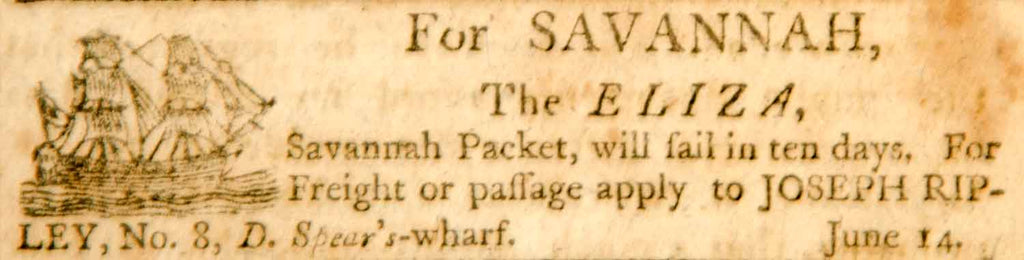 1798 Ad Savannah Packet Eliza Joseph Ripley No. 8 D Spear's Wharf Ship YJR1