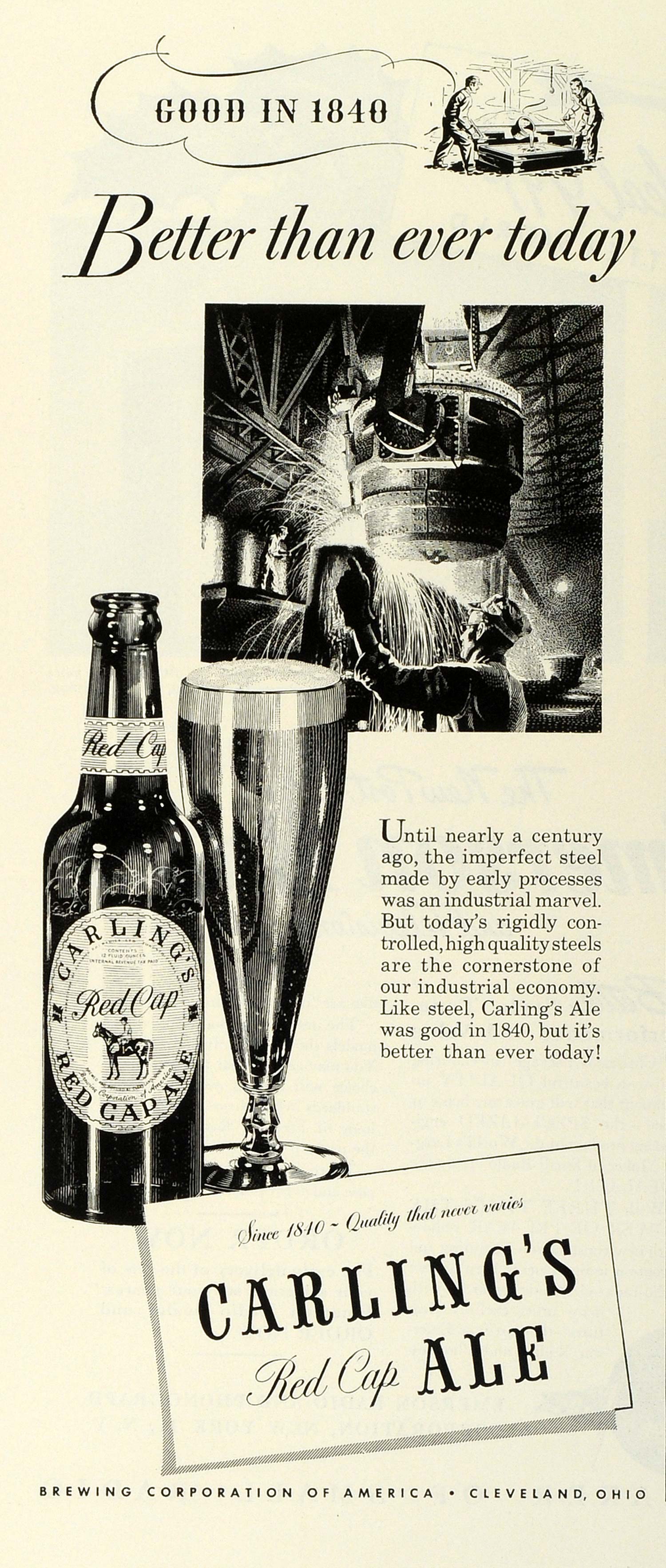 This is an original 1945 black and white print ad for the Carling's Red Cap Ale from Brewing Corporation of America located in Cleveland, Ohio.