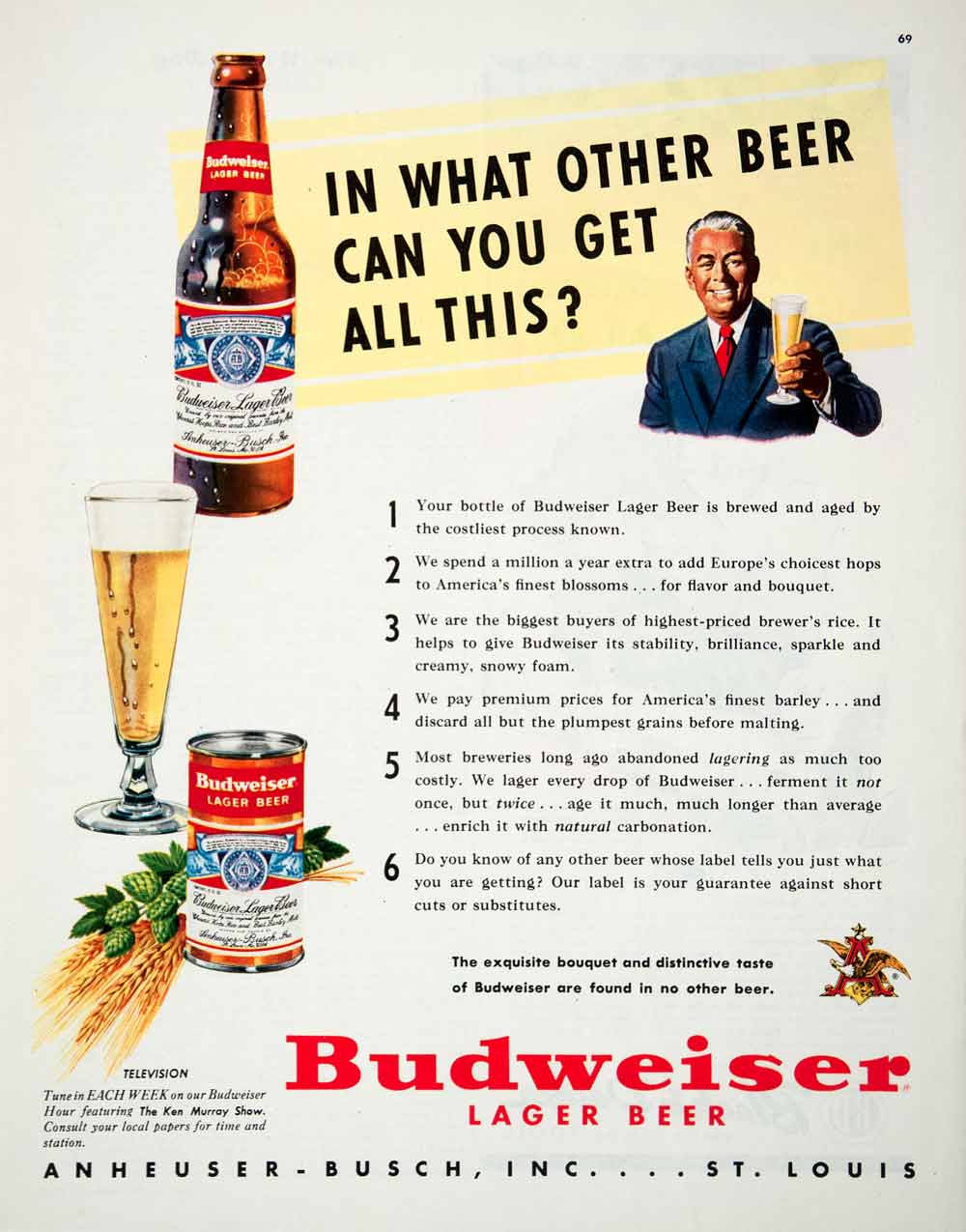 This is an original 1950 color print ad for Budweiser Beer from Anheuser-Busch, Inc. in Saint Louis, Missouri. This product was endorsed on the Ken Murray Show once a week.