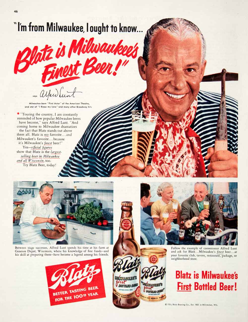 1951 Ad Blatz Beer Milwaukee Alfred Lunt American Theatre Star Genesee COLL3