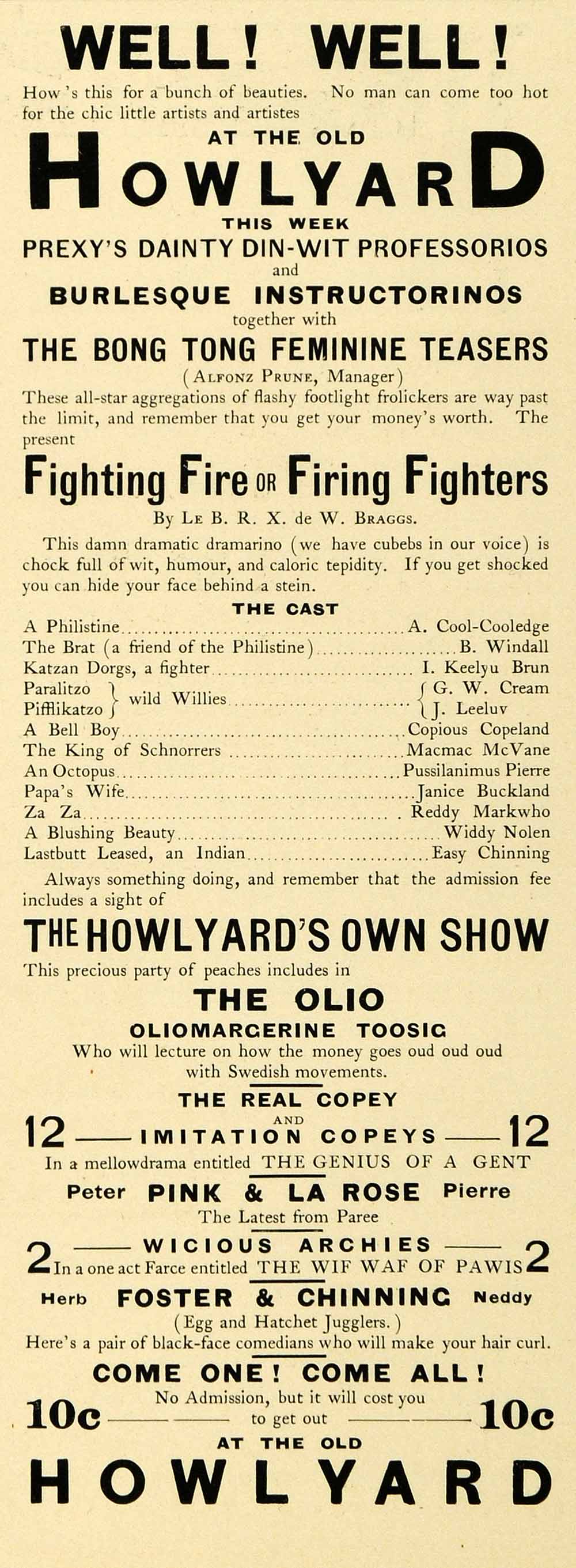 This is a small original 1900 black and white print ad from the Harvard Lampoon for a theatrical production entitled "Fighting Fire or Firing Fighters" being shown at the Howlyard.